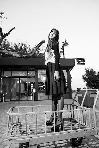Ətək MIU MIU, kofta PRADA, ayaqqabı MIU MIU