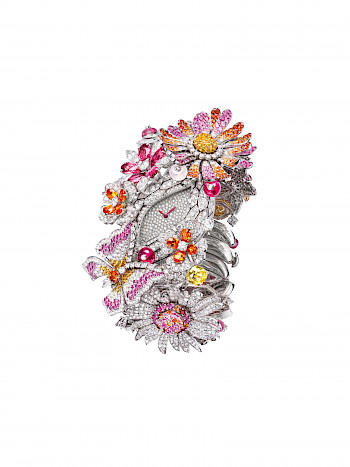 the new Eden Gardens of Wonders watch is one of the most incredible jewellery watches made by Bulgari: 4000 hours, 6500 stones, 70 different petals, and more than 200 carats with a manually wound skeletonized turbillon movement. This is when high-end jewellery meets high-end horology