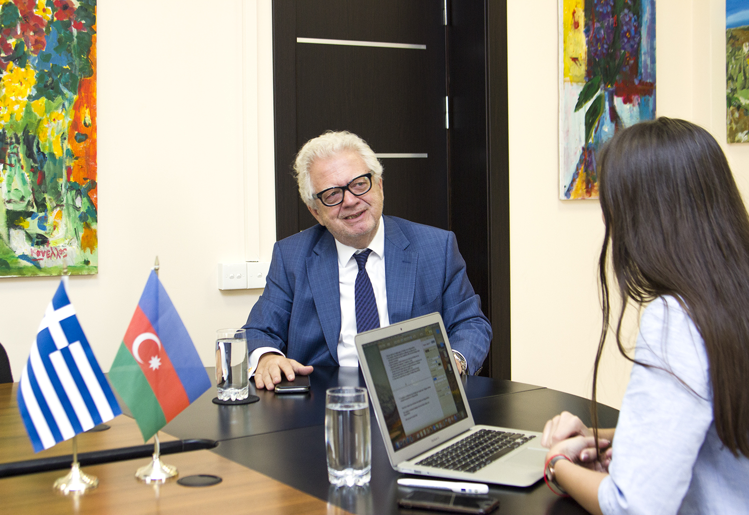 В 2017 году в должность вступил новый посол Греции в Азербайджане – Николаос Д. Канеллос. Писатель и художник, господин Канеллос поведал нам творческое видение отношений между Азербайджаном и Грецией. Не обошлось и без философии - важнейшей составляющей греческой и восточной культуры. Разговор начался с предложения известного кофе по-гречески: «Θέλετε κάτι για να πιείτε; Ελληνικό καφέ;»