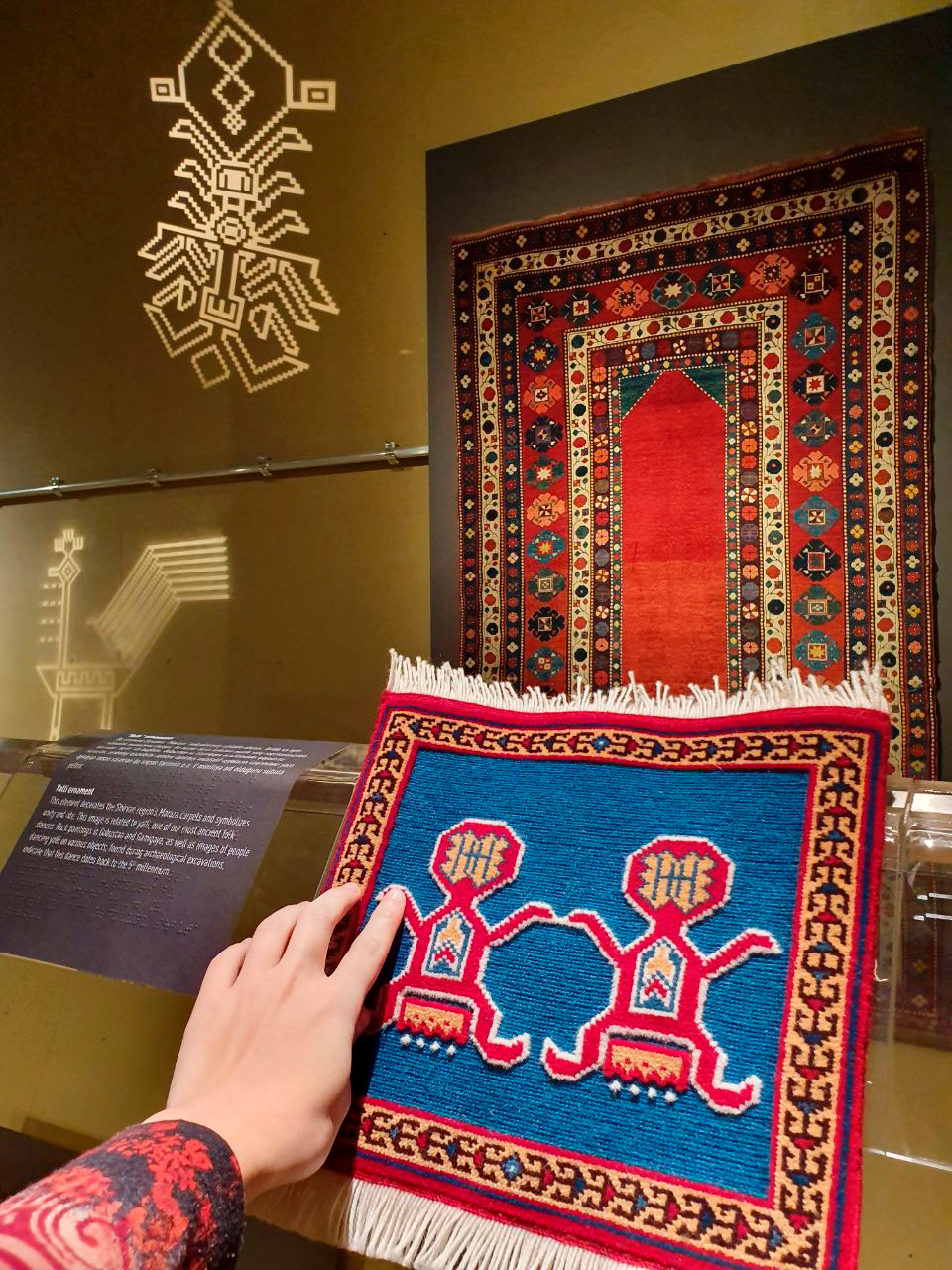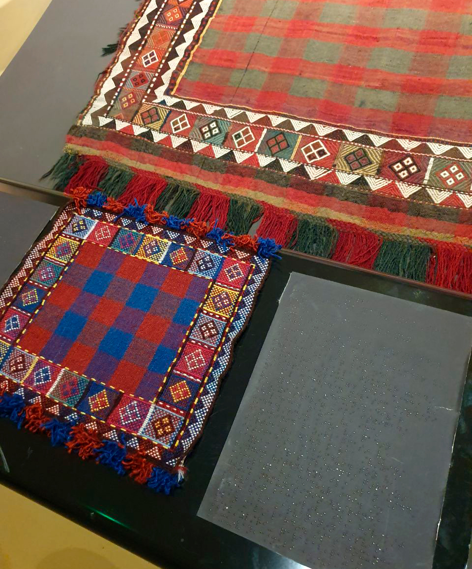 Тем временем в мире уже более 39 миллионов незрячих людей, около 50 000 из них – в Азербайджане. Мы не можем рассказать этим людям, что видим, зато можем помочь увидеть то же самое – кончиками пальцев. В Азербайджанском национальном музее ковра есть все условия для передвижения на инвалидных колясках, с начала 2019 года экспонаты, представленные на первом этаже музея, доступны для тактильного знакомства, их сопровождают аудиозаписи на азербайджанском и русском языках и надписи универсальным рельефно-точечным шрифтом Брайля. В этом году Музей ковра стал первым инклюзивным музеем в Азербайджане, а в преддверии Международного дня слепых был запущен новый социальный проект «Музей без границ», реализованный совместно с Министерством культуры. В рамках проекта ткачихи отдела традиционных технологий музея соткали миниатюрные образцы десяти ворсовых и безворсовых ковров из постоянной коллекции, которые теперь можно потрогать руками на втором этаже. Это позволит людям с нарушениями зрениями ощутить особенности разных азербайджанских ковров, «увидеть» их рельефный орнамент и оценить старинные техники безворсового ткачества, утерянные и восстановленные уже в наши дни. Каждый образец сопровождается заметкой в точечном шрифте Брайля – на английском и азербайджанском языках.