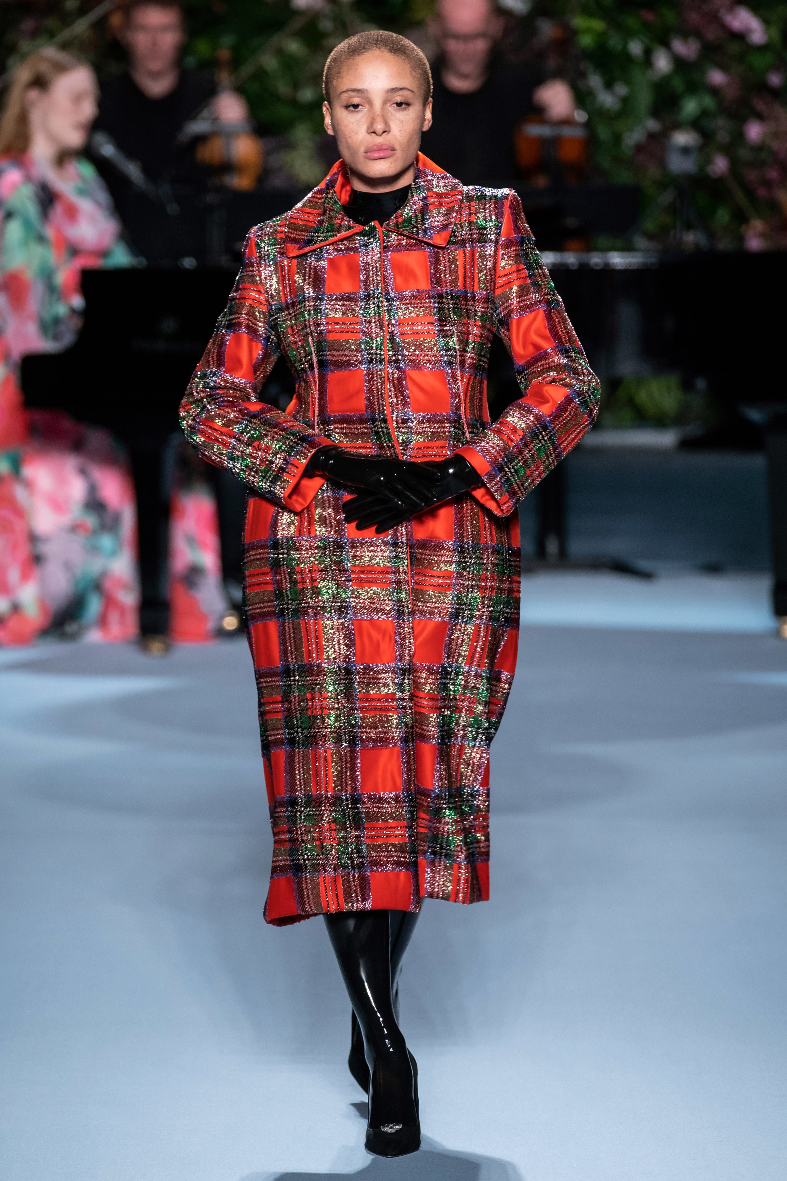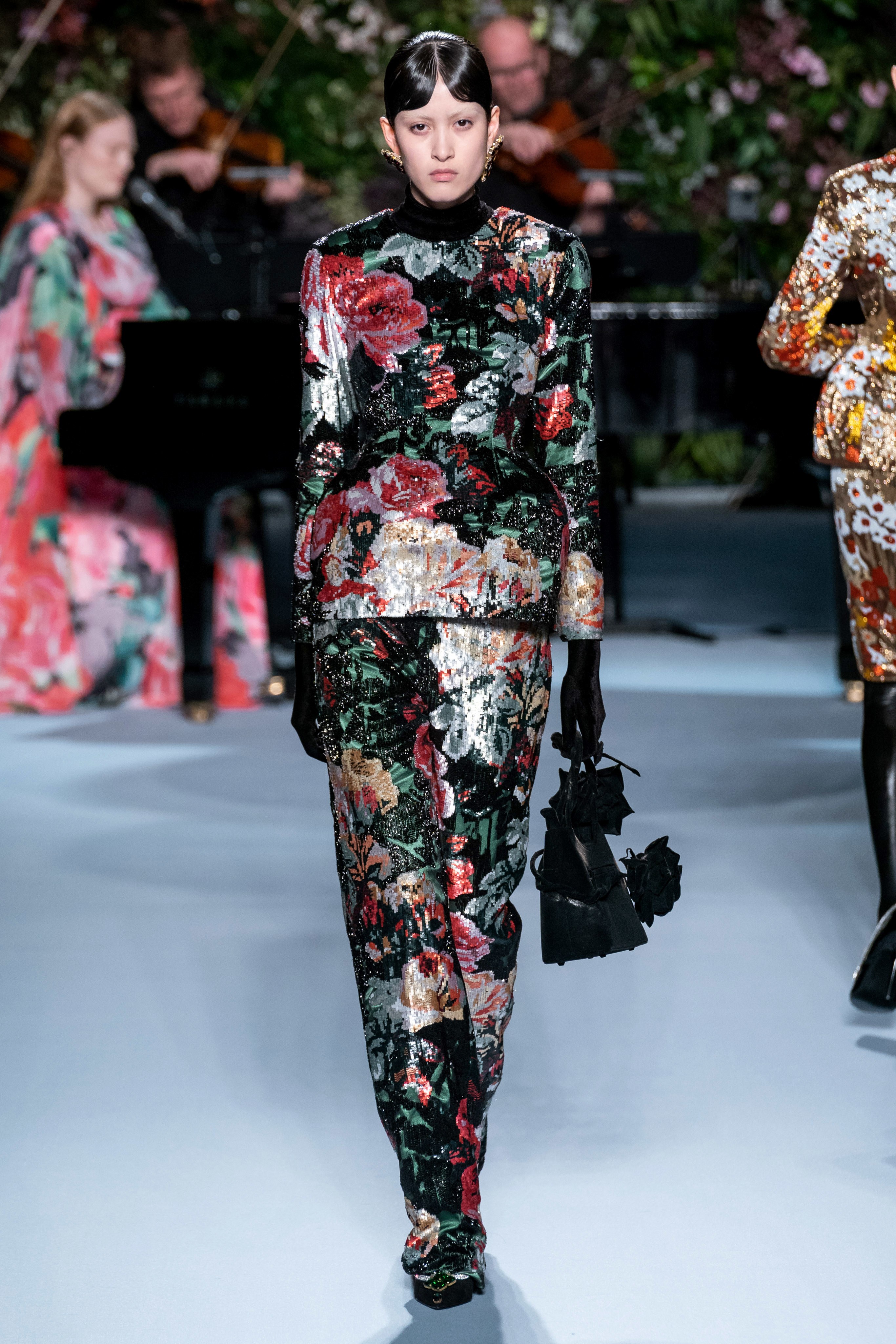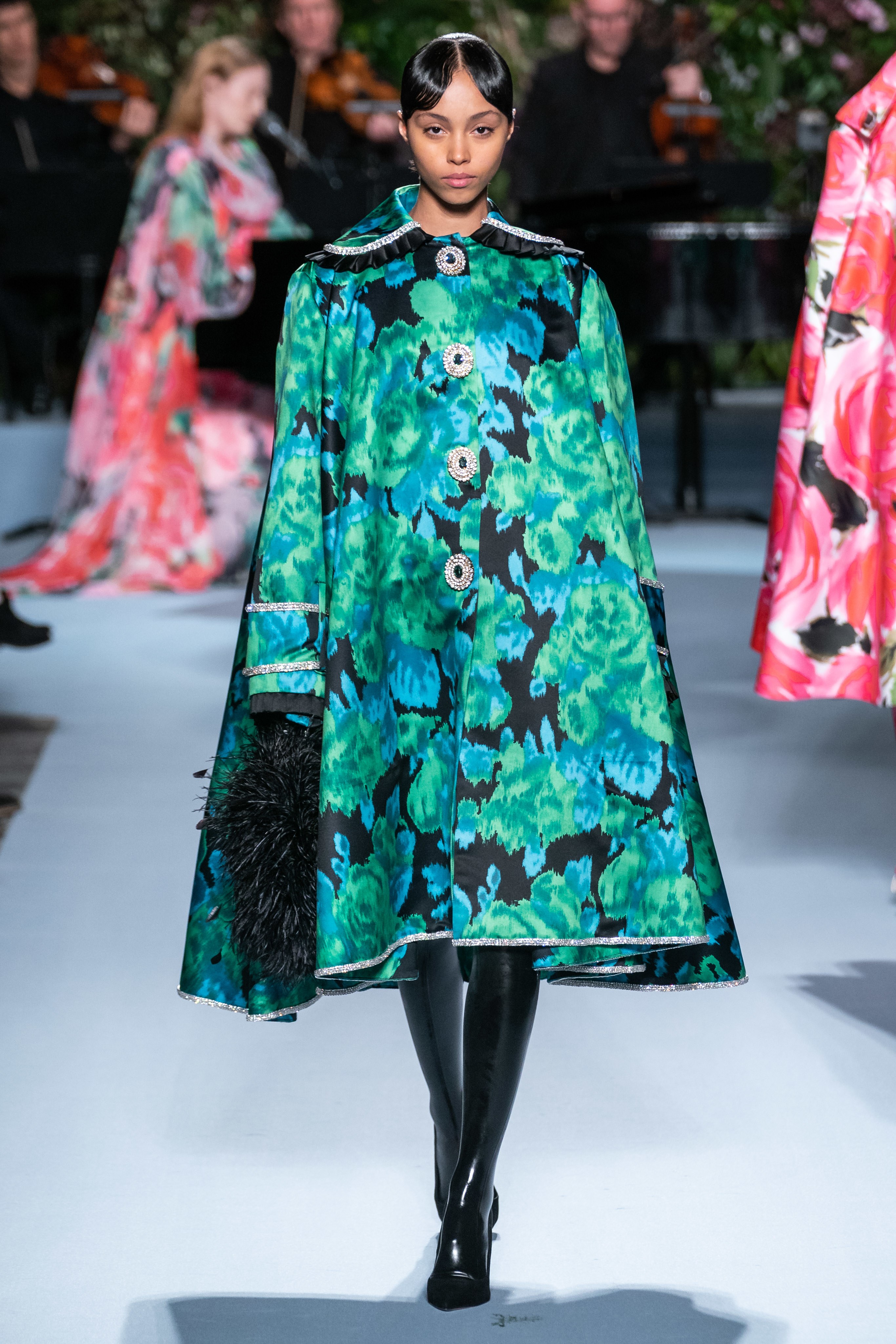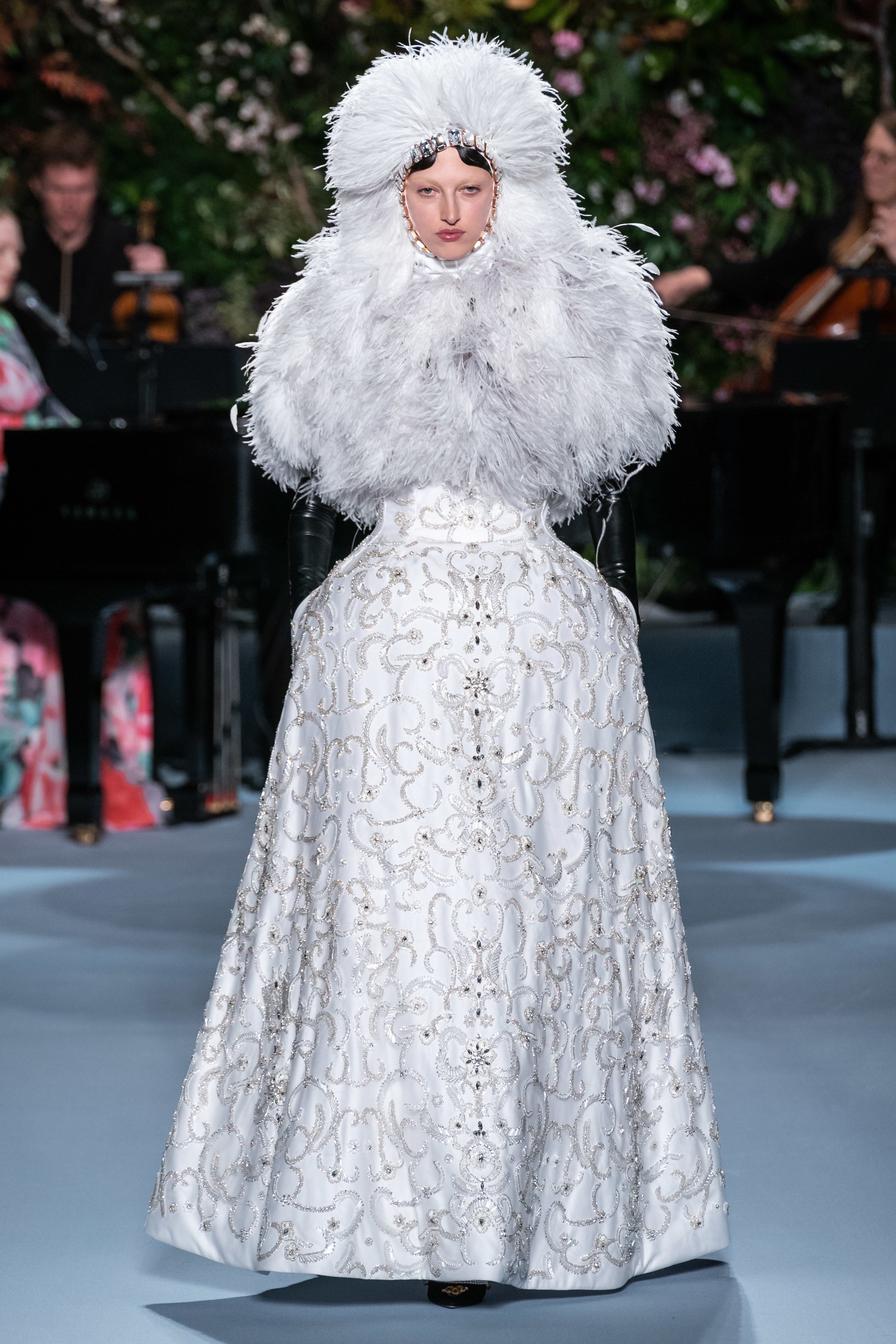 Вчерашний показ Ричарда Куинна – живое олицетворение таинственного сада: вся сцена была украшена ветками, цветами и виноградными лозами. За показами Куинна следят самые знаменитые личности, среди которых Её Величество. На этот раз дизайнер пригласил начинающую британскую певицу Фрейю Ридингс, которая сыграла на огромном рояле, освещённом гигантской люстрой, что придало модной атмосфере волшебства.