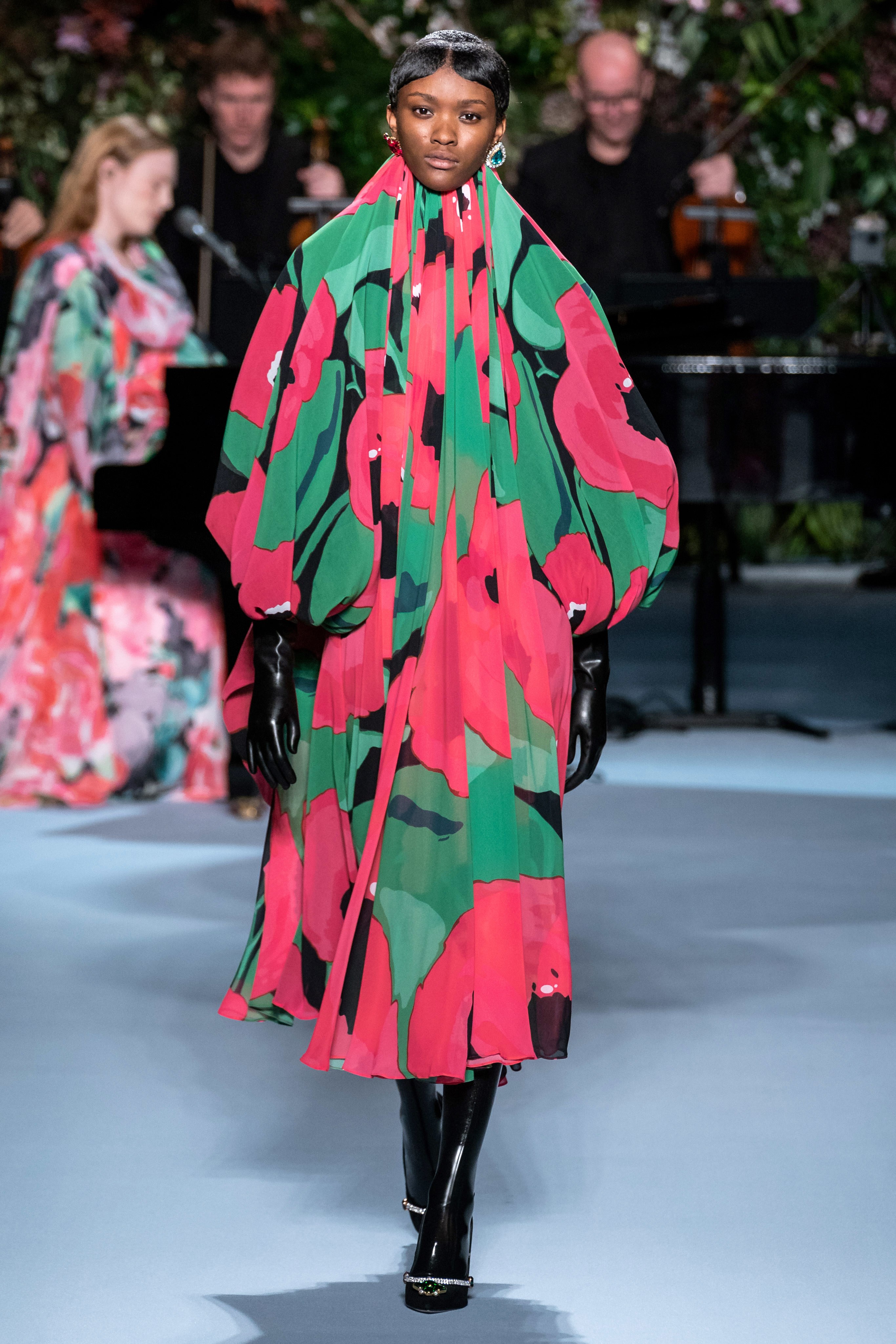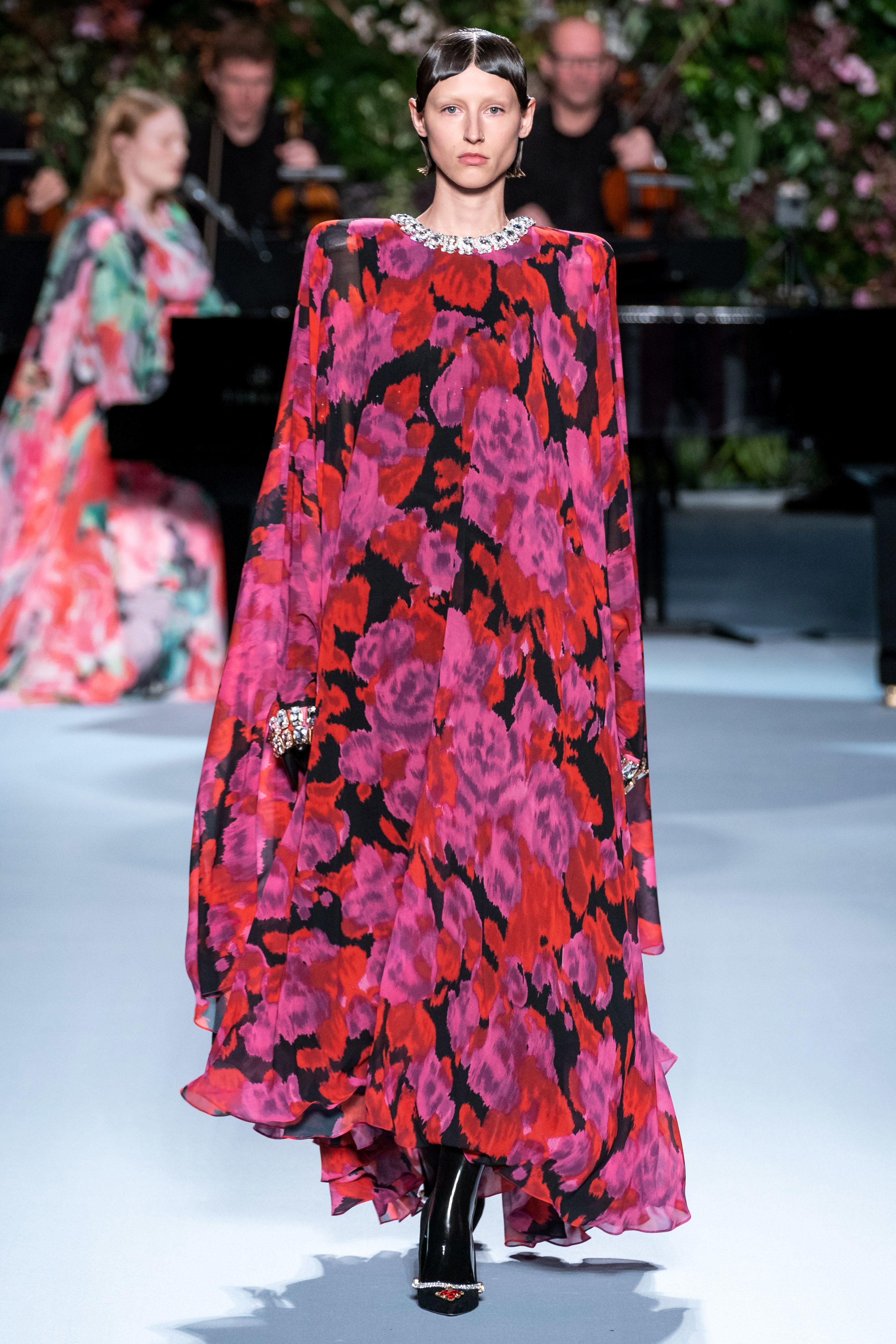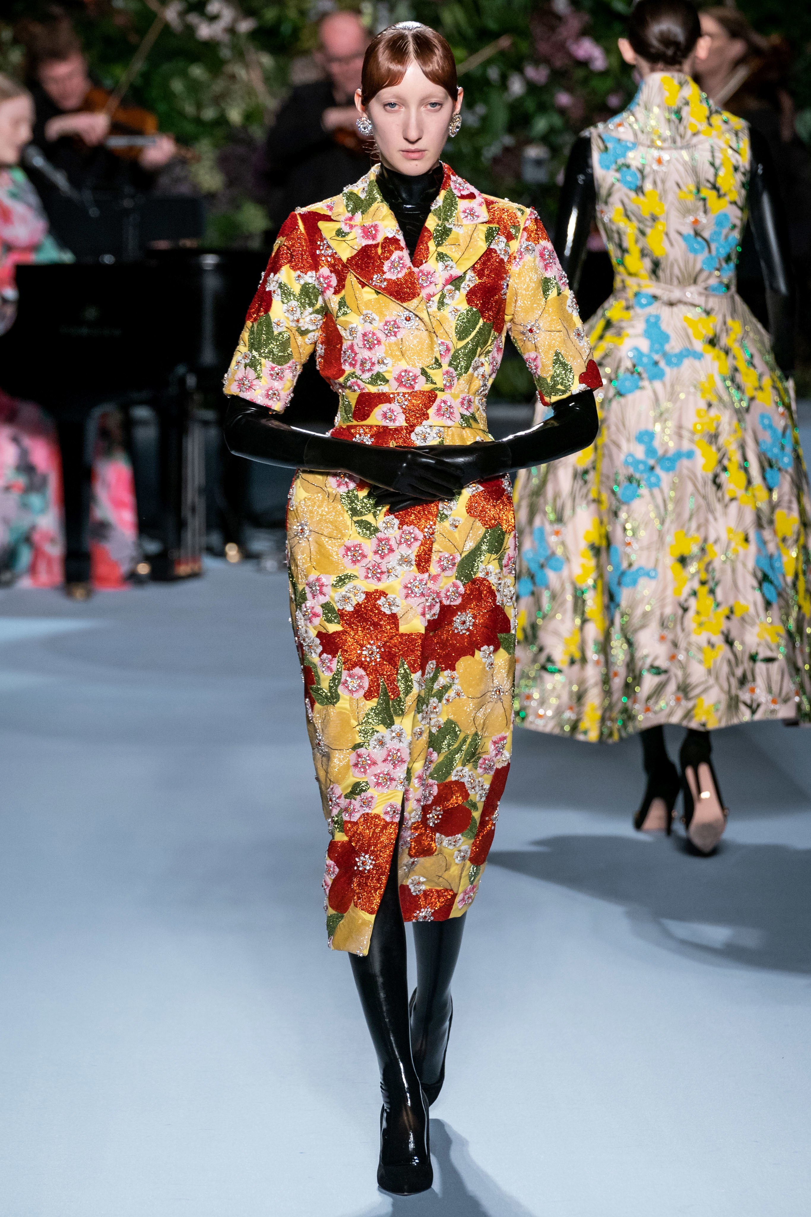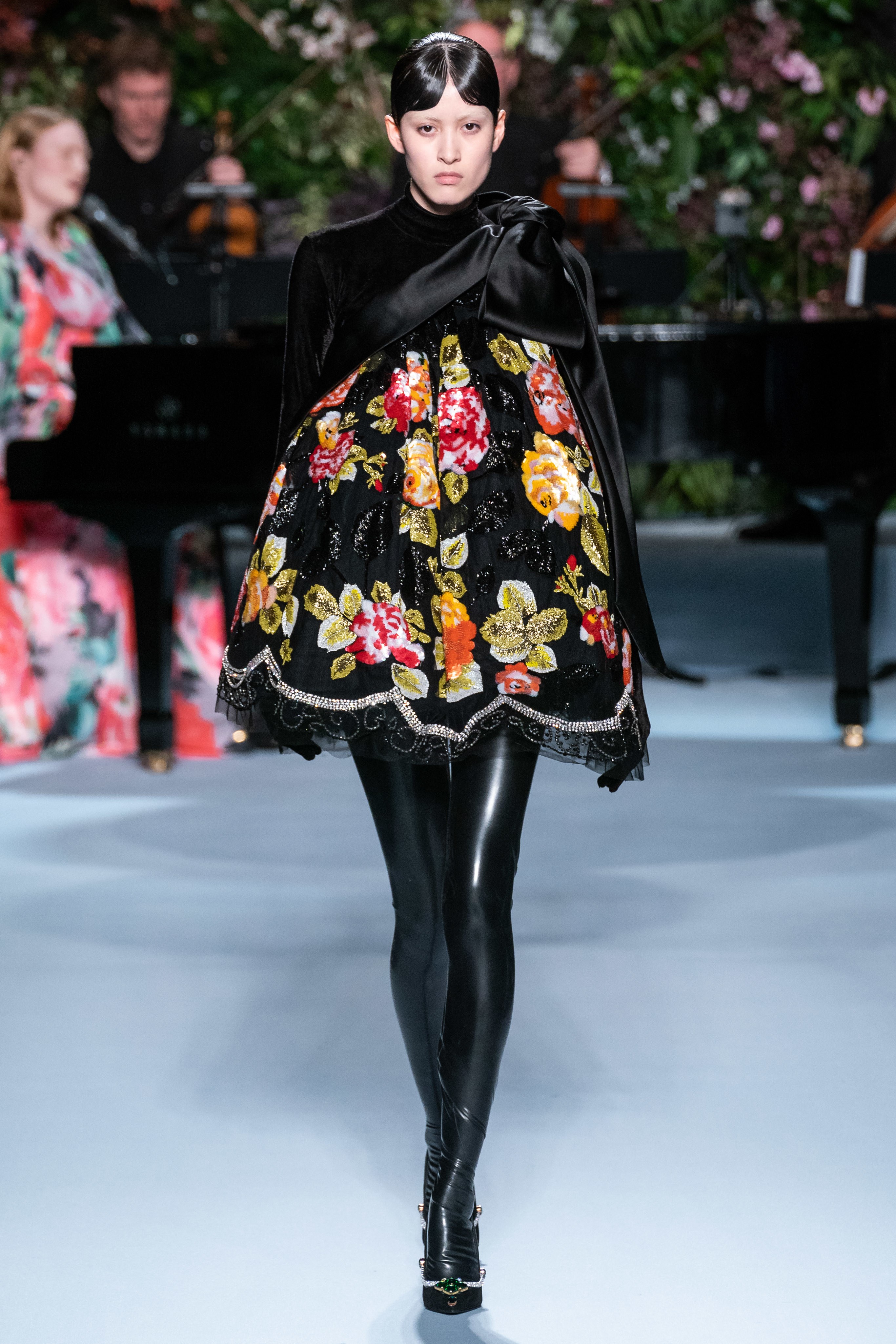 Вчерашний показ Ричарда Куинна – живое олицетворение таинственного сада: вся сцена была украшена ветками, цветами и виноградными лозами. За показами Куинна следят самые знаменитые личности, среди которых Её Величество. На этот раз дизайнер пригласил начинающую британскую певицу Фрейю Ридингс, которая сыграла на огромном рояле, освещённом гигантской люстрой, что придало модной атмосфере волшебства.