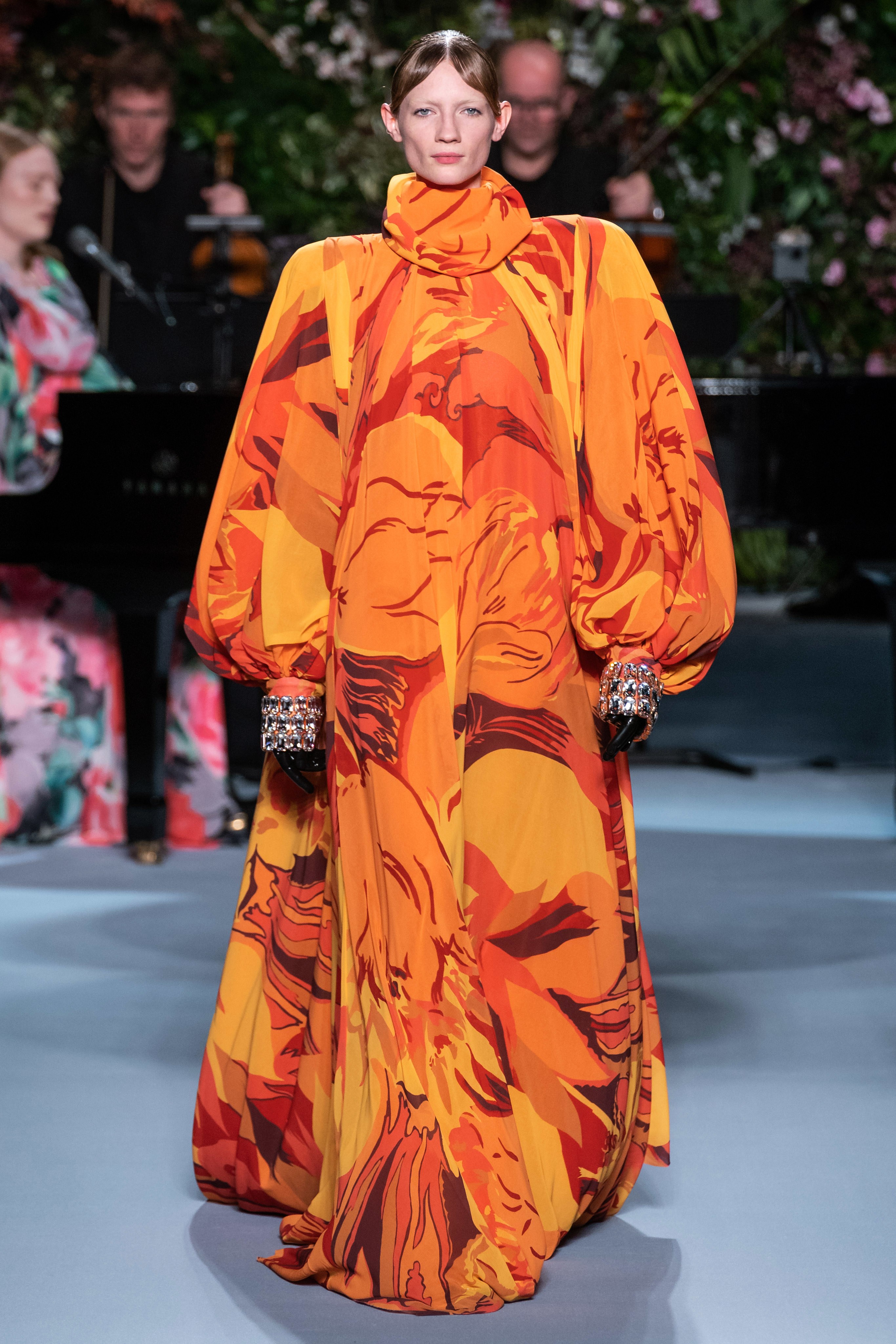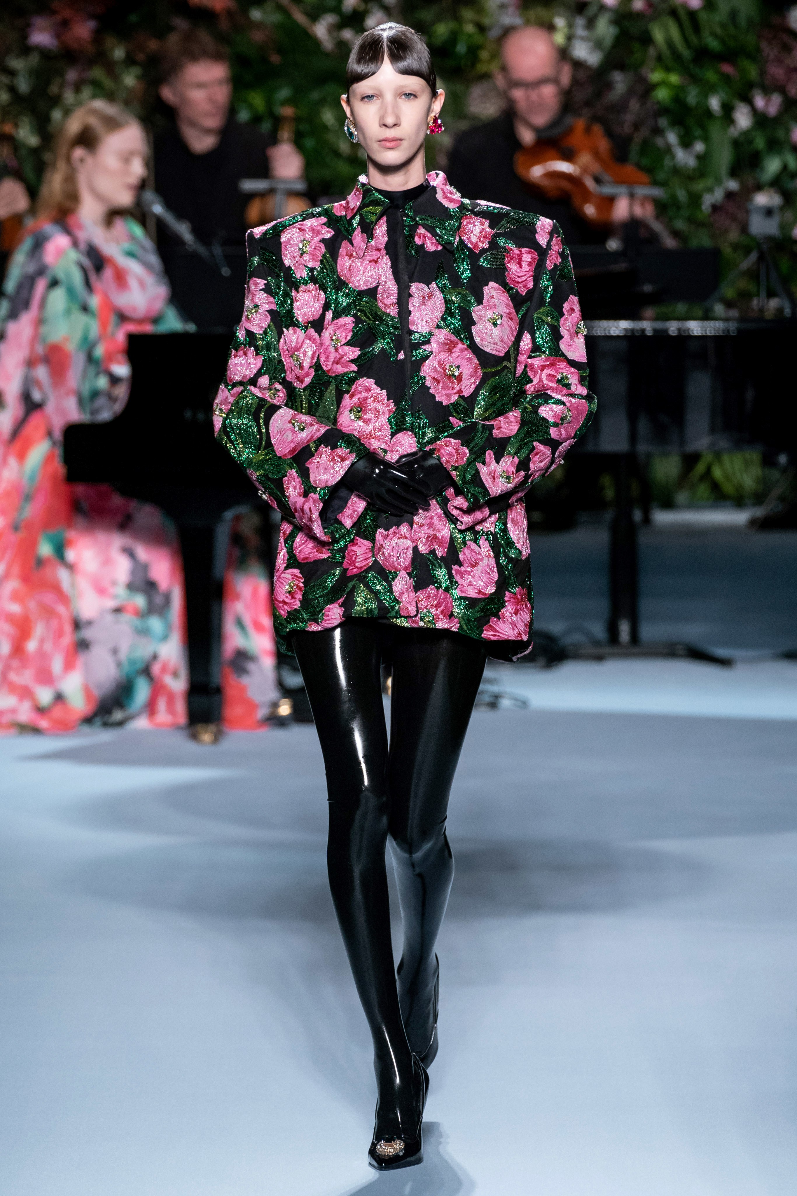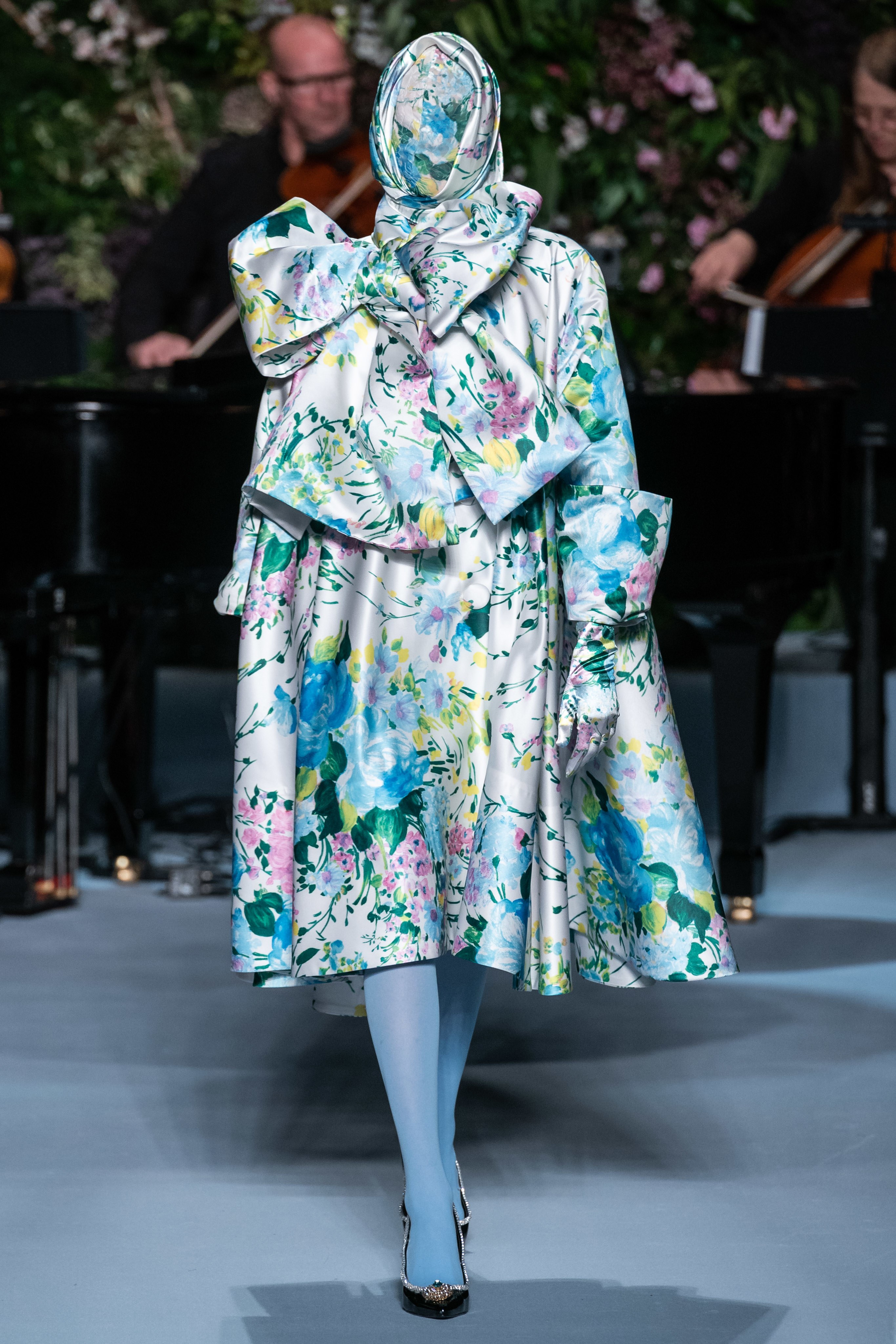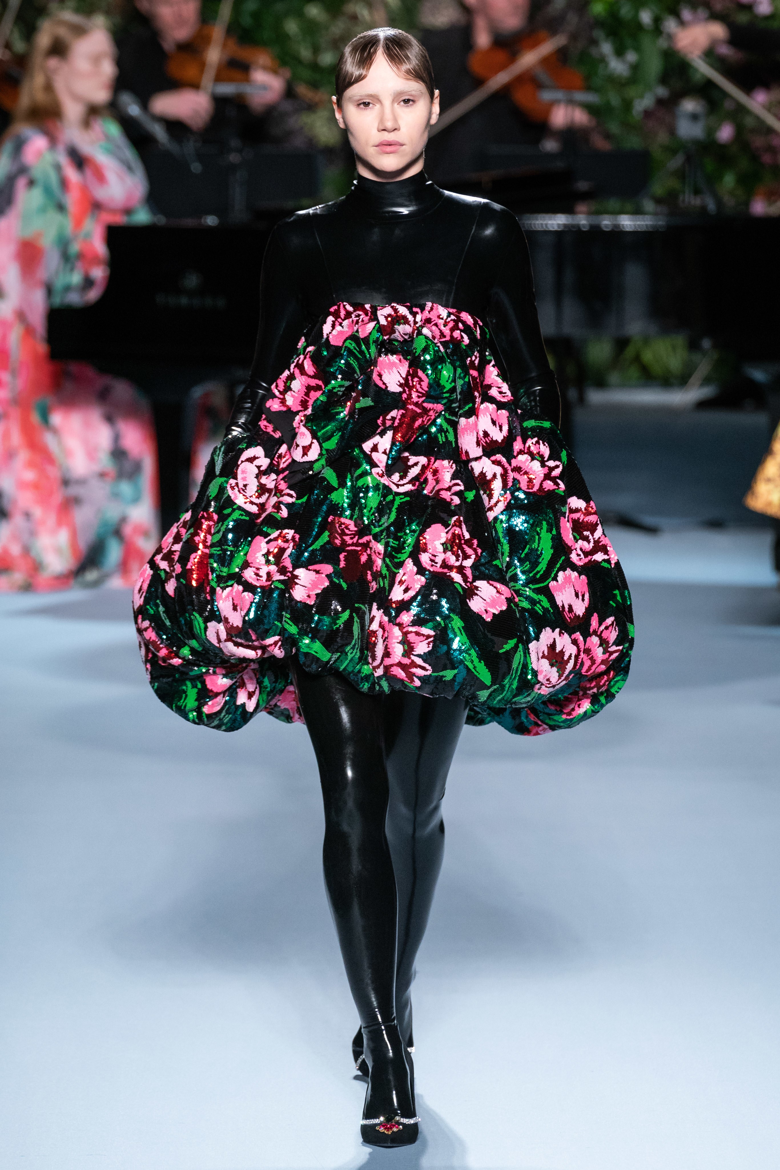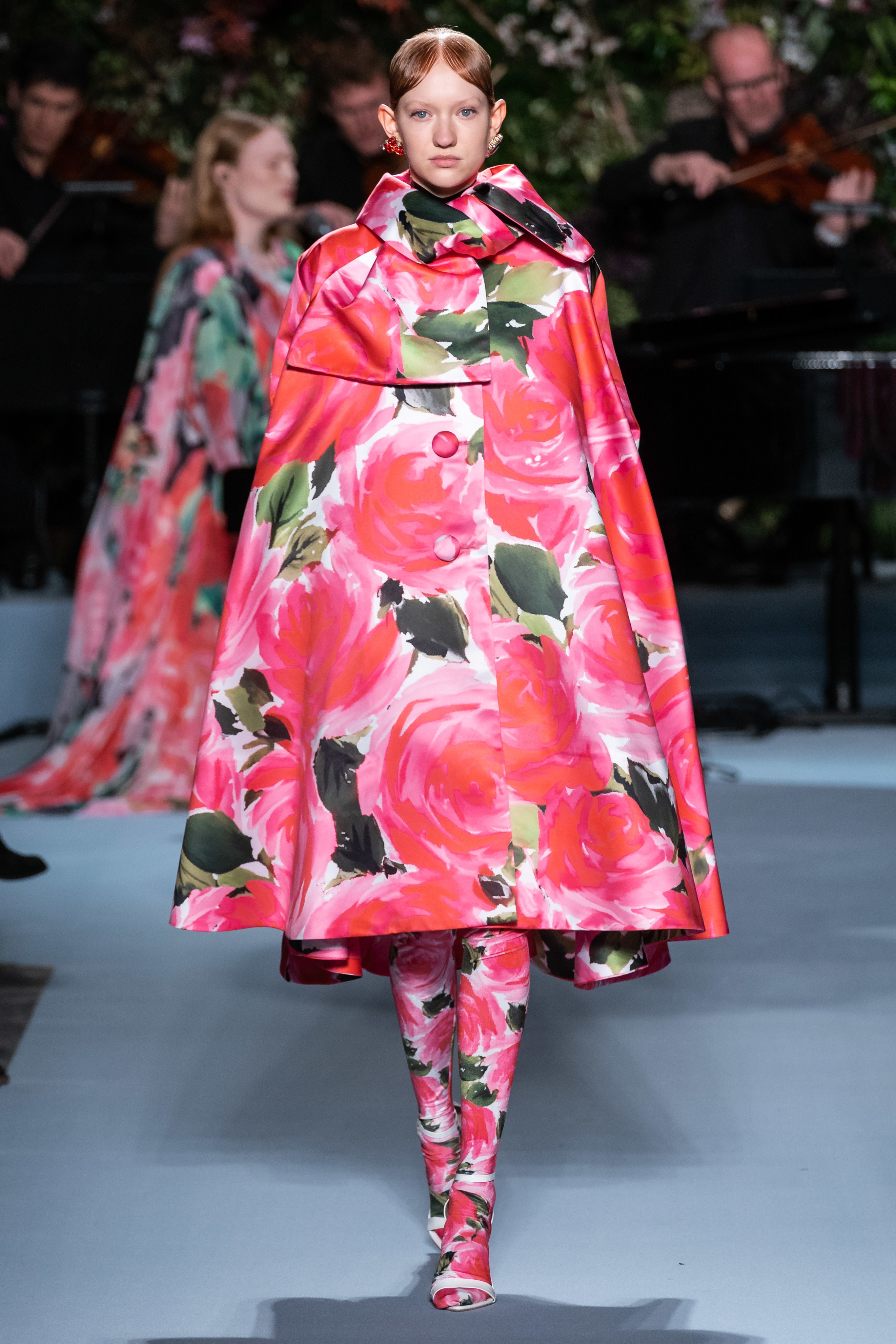 Вчерашний показ Ричарда Куинна – живое олицетворение таинственного сада: вся сцена была украшена ветками, цветами и виноградными лозами. За показами Куинна следят самые знаменитые личности, среди которых Её Величество. На этот раз дизайнер пригласил начинающую британскую певицу Фрейю Ридингс, которая сыграла на огромном рояле, освещённом гигантской люстрой, что придало модной атмосфере волшебства.