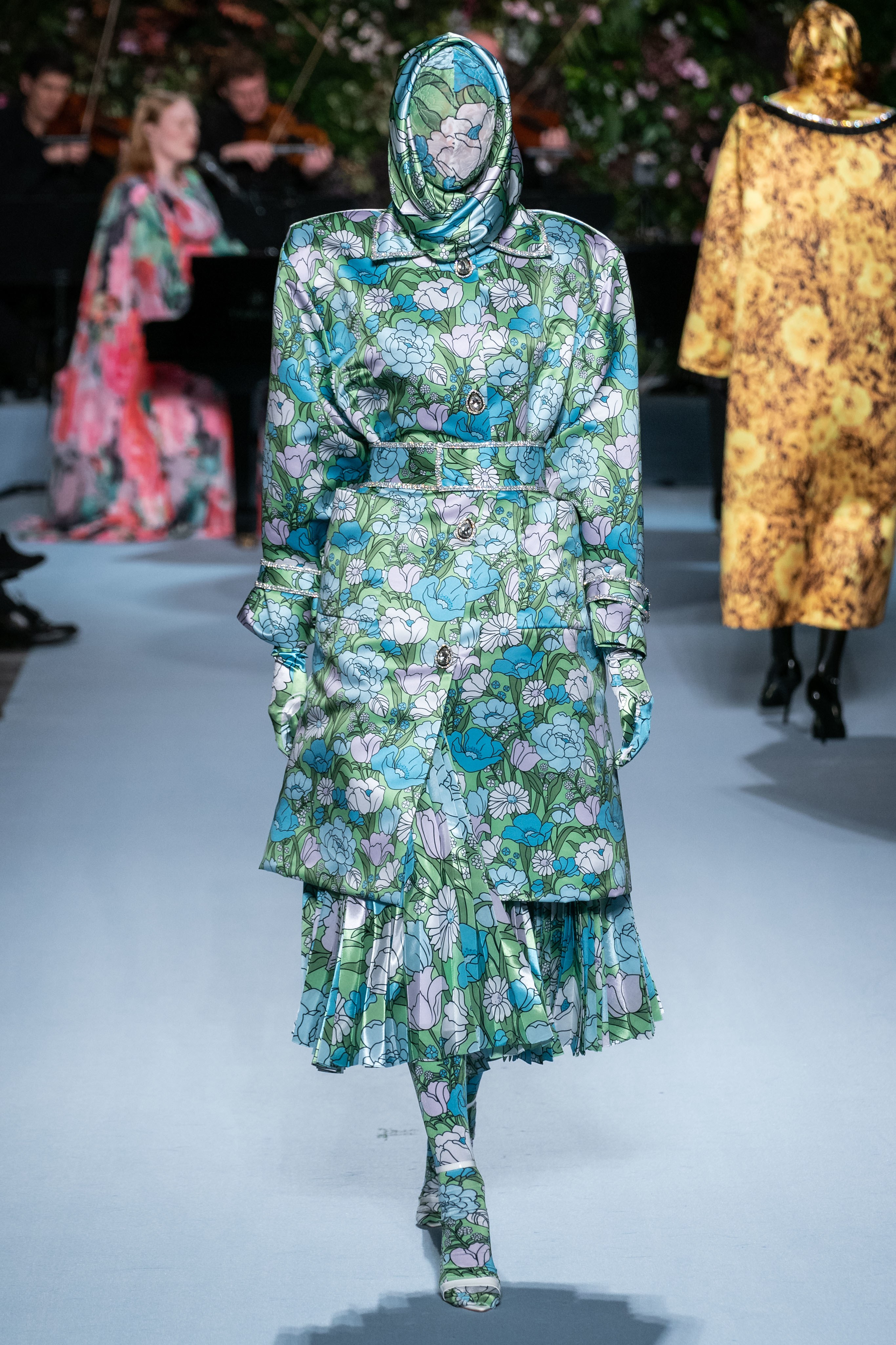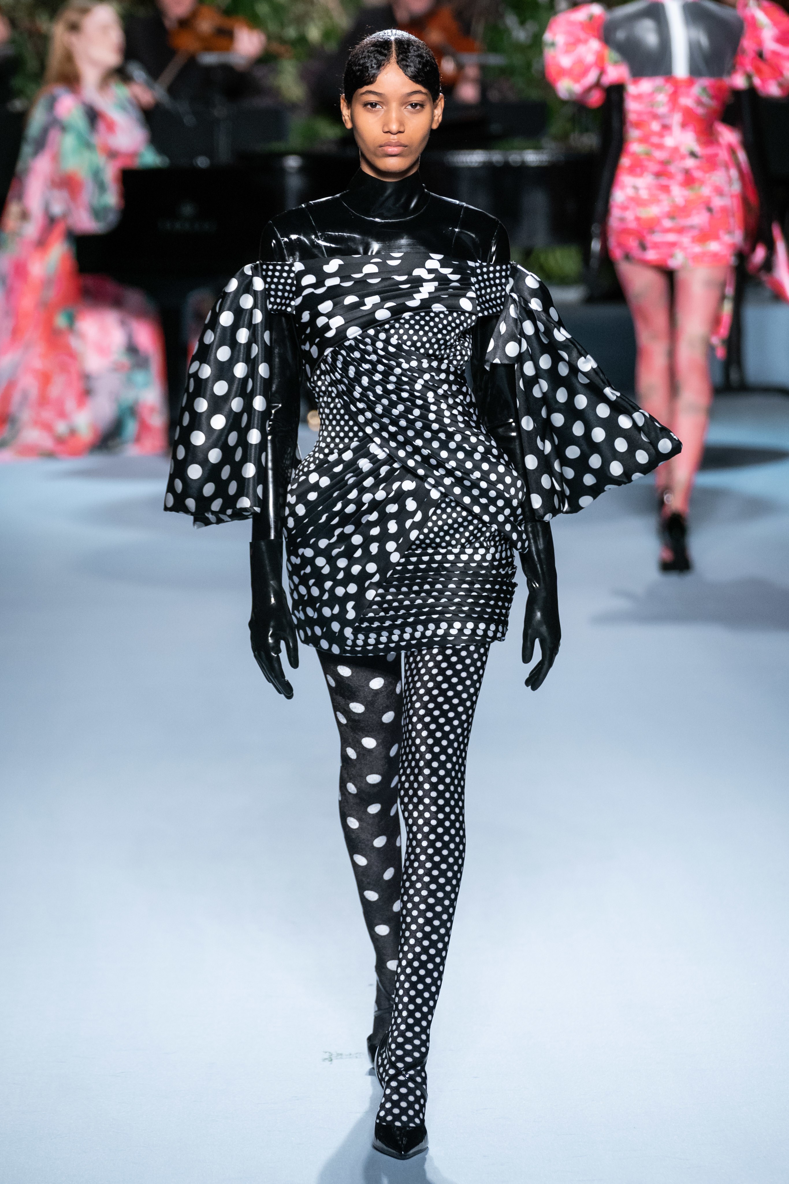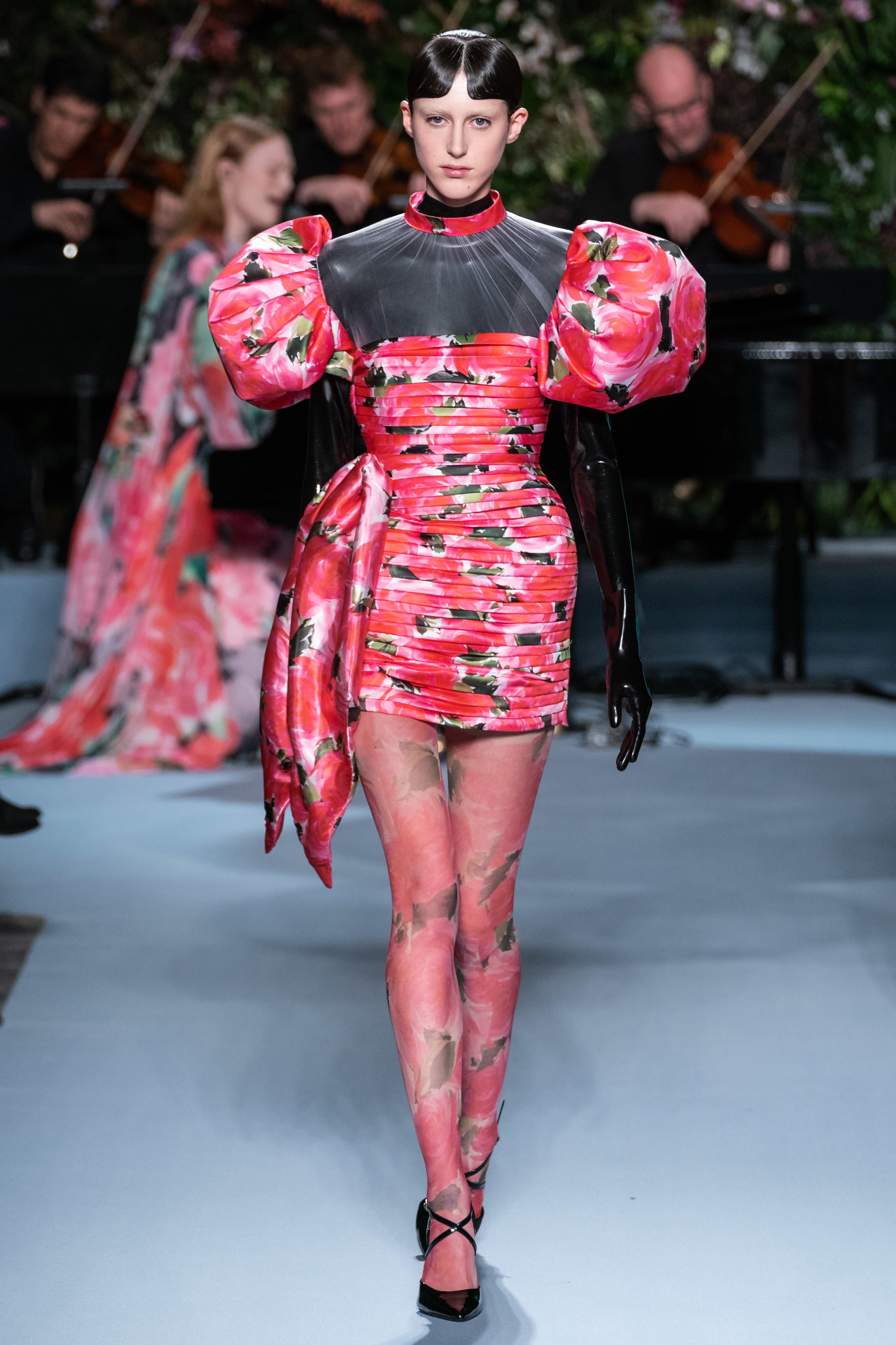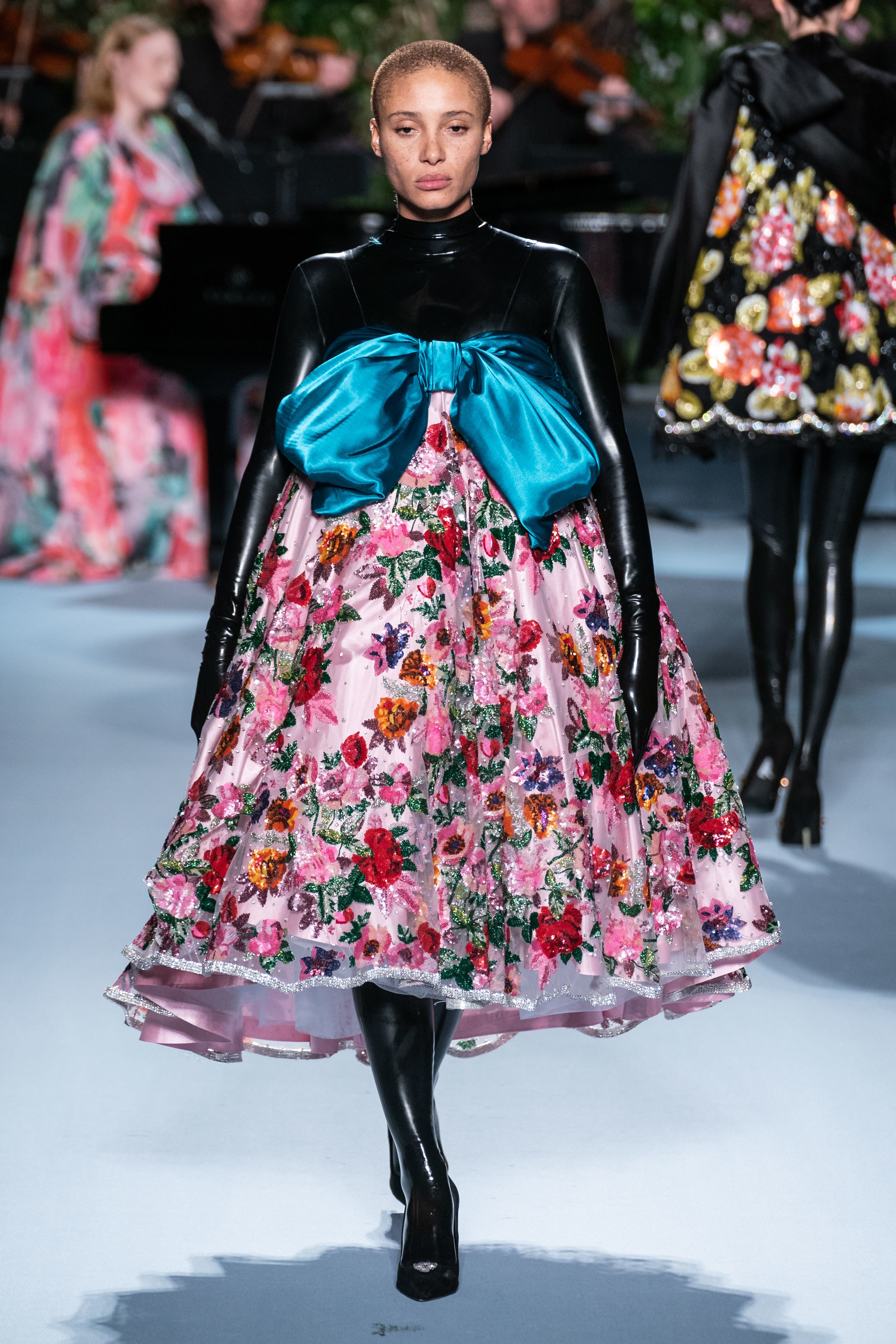 Вчерашний показ Ричарда Куинна – живое олицетворение таинственного сада: вся сцена была украшена ветками, цветами и виноградными лозами. За показами Куинна следят самые знаменитые личности, среди которых Её Величество. На этот раз дизайнер пригласил начинающую британскую певицу Фрейю Ридингс, которая сыграла на огромном рояле, освещённом гигантской люстрой, что придало модной атмосфере волшебства.