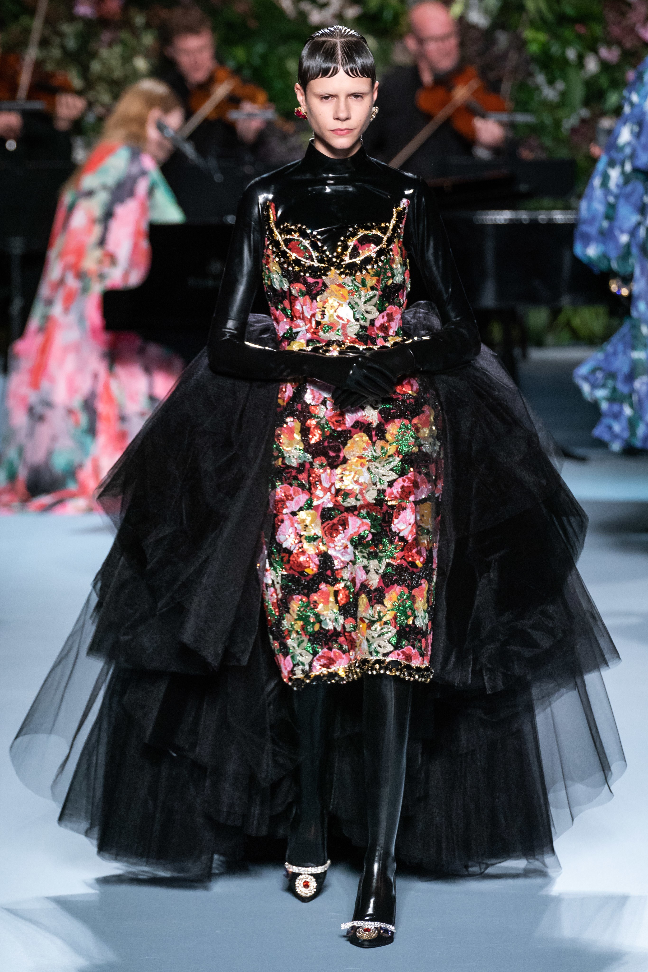 Сама коллекция пропитана духом британской культуры. Главные её отличия – цветочные принты, наряды с орнаментом тартан, блестящие манжеты и корсеты.