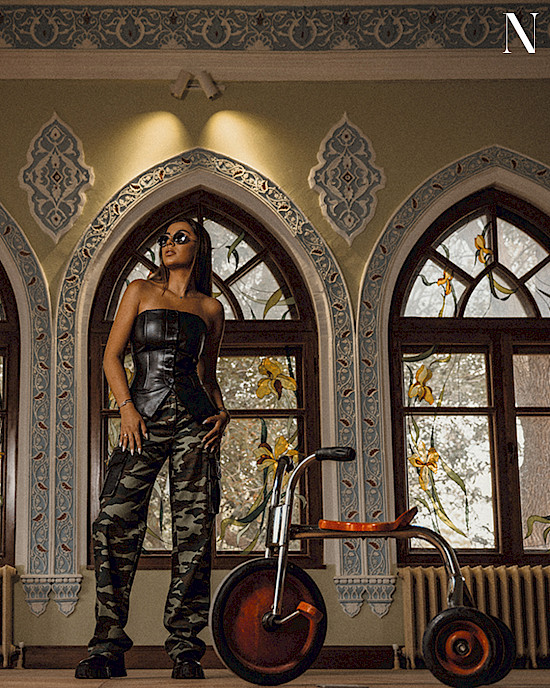 Leather corset FANTÔME DESIGN, shoes PRADA, glasses RAY-BAN