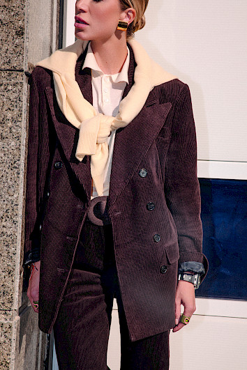 Жакет и обувь THE ROW, поло THE REAL BASE, брюки и свитер MASSIMO DUTTI, серьги KHAITE, кольца CHANEL.