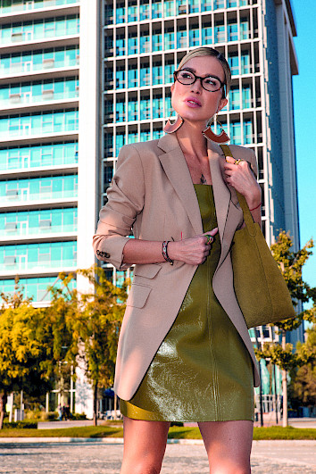 Платье 1811 EIGHTEEN ONE ONE, жакет MODU, сумка THE ROW, серьги CHLOÉ, солнцезащитные очки MIU MIU