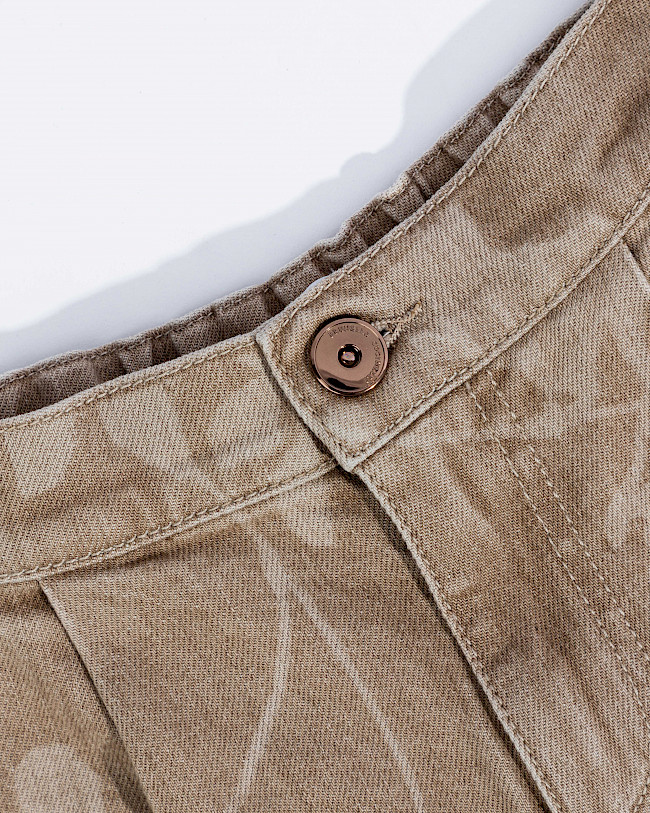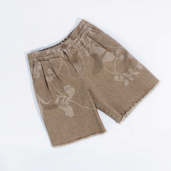Любая привычная вещь заиграет новыми красками, если немного пофантазировать. Так, Бермуды из комфортного хлопкового денима приобрели модный вид, благодаря сложной технологии лазерного принта в виде сезонного цветочного узора, а необработанные края добавляют неформальный штрих.