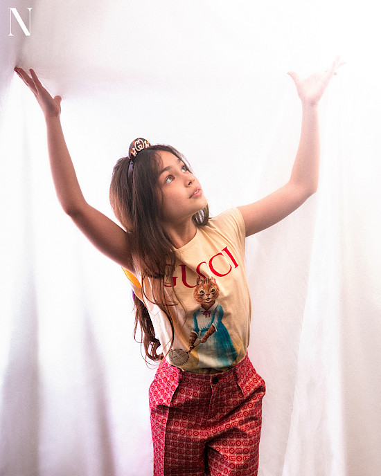 Banu: clothing DOLCE & GABBANA KIDS/Leyla: T-shirt, hat, shoes BURBERRY KIDS, shorts GUCCI