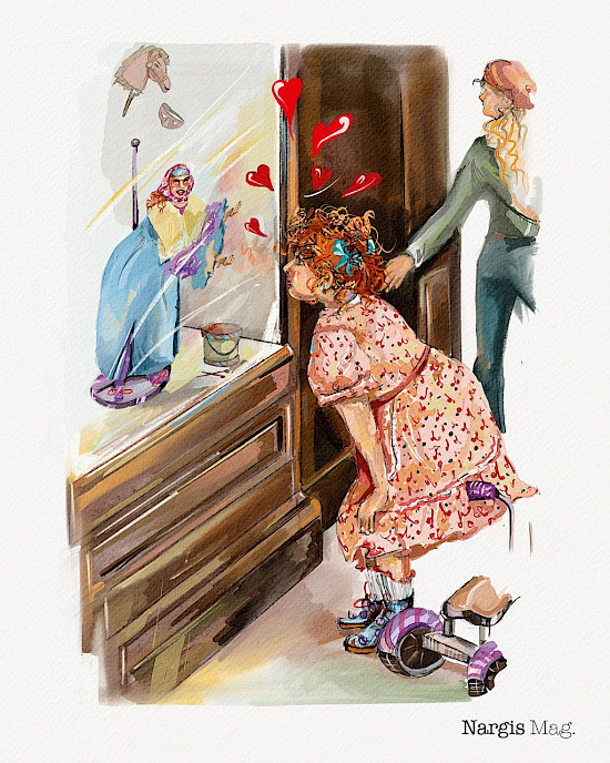 «Not only adults want to stand out with their clothes, some people get this feeling in their childhood, when you wanted to make unusual clothes for your dolls, for example. In my illustration, the girl is dressed in a cute feminine dress, but in her heart she wants to look brighter like the doll she saw in the window. She forgets about her favorite bicycle, and her mother starts calling her to go on. But the girl's eyes are caught only by this fashionable doll with glasses, dressed by the brand «Anrealarge».