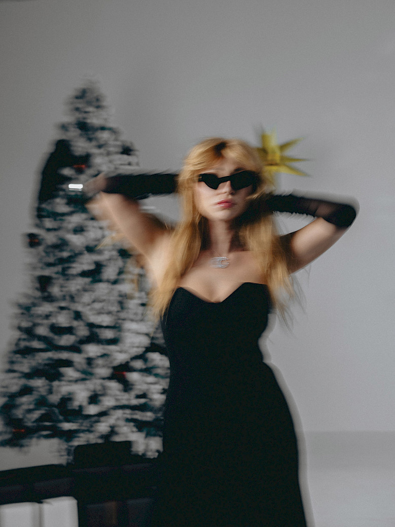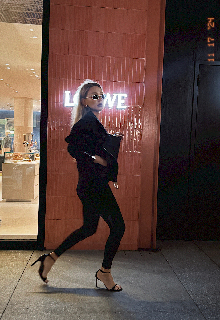 Don SAINT LAURENT, çəkmələr MARIAM GVASALIA, sırğalar SAAD COLLECTION, eynək CHANEL