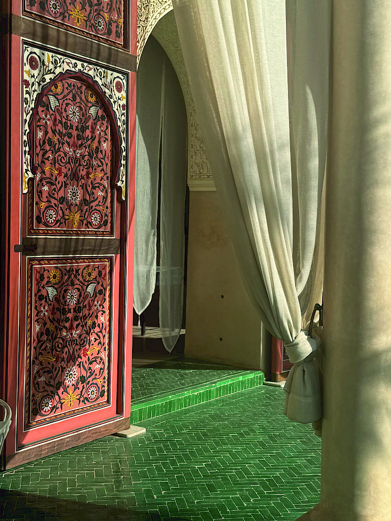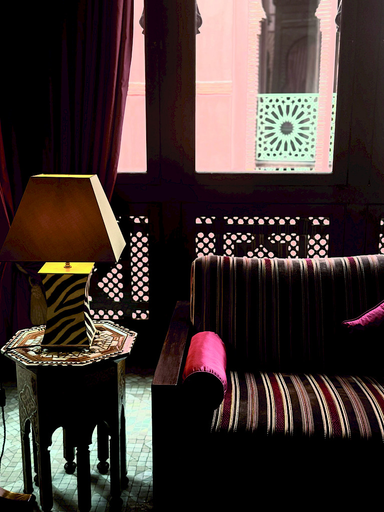 All the staff appear and disappear invisibly; they appear from each of the three floors of the hotel exactly when there are no guests on the floor. The Grand Riad and Spa is designed for politicians and heads of state — for people who are very recognizable but don’t want to be recognized. It is like a mini palace with its separate territory. There is a separate entrance and entry from the underground car park. For example, a person can fly to Marrakech in his private plane, get into a car, which at a certain point ‘dives’ under the ground and he is already brought to the underground car park, to the lift doors, and from there he enters the Grand Riad and Spa.