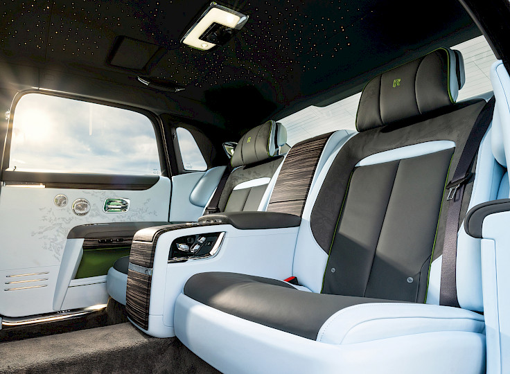 Avtomobilin interyeri sadəcə - möhtəşəmdir! Avtomobilin daxilində mərkəzi yeri en boyu uzanan şüşə panel tutur. Buraya sürücü üçün virtual alətlər, informasiya və əyləncə ekranı daxildir. Avtomobilin rəqəmsal ekosisteminin əsasını SPIRIT proqram təminatı təşkil edir. Bu, avomobilin əsas funksiyalarını özündə birləşdirən multifunksional interfeysdir. 18 səsucaldıcı və 1400 vatt güclü electron gücləndiriciyə malik audio sistemi, Ghost Series II-nin interyerini əsl konsert salonuna çevirir. Ghost Series II mühəndisləri, xairici səsin izolyasiya edilməsi üçün xüsusi materiallardan və texnologiyalardan istifadə edərək kənar səslərin azaldılmasına xüsusi diqqət yetiriblər. Nəticədə, siz Ghost – un içində olduğunuzda, hətta yüksək sürətlə hərəkət edən zaman yolun və küləyin səsini eşitmir və musiqidən zövq ala bilirsiniz. Ghost həmçinin "Placed Perforation" adlanan maraqlı bir daxili dizayn təklif edir; burada 107,000 perforasiya oturacaqlardan istifadə edilib və Rolls-Royce-un Goodwood-dakı qərargahının üzərindəki buludların formasını təqlid edir.