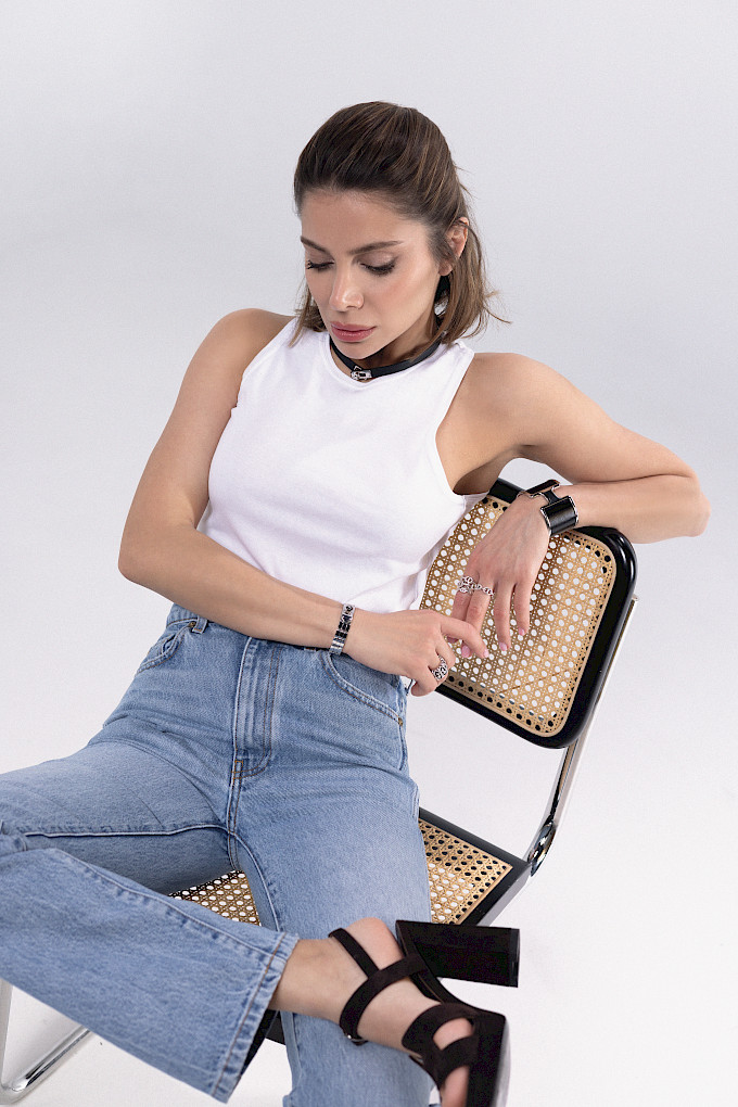 Top RAEY, jeans KHAITE, shoes HERMÈS, jewellery HERMÈS and CHROME HEARTS