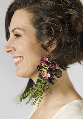 Twelve years ago, I saw a picture in a design book of a beautifully set table in a home in Paris. On each plate was a wonderful botanical purse as a gift from the hostess. They all were different and they really struck my fancy. I figured out how to make them and sold a lot of them for flower girls. Next, I was inspired by pictures of beautiful flower shoes in a book by Michel Tcherevkoff called Shoe Fleur: A Footwear Fantasy. It is a gorgeous book of a selection of virtual botanical shoes and purses. Curiosity drove me to figure out how to design botanical shoes. A couple of years later, a local photographer asked me to do a botanical headpiece for a photoshoot, and I figured out how to make one. Nine years later, we still do several photoshoots a year on botanical headpieces. In 2013, a student asked me how to make a botanical ring, and curiosity once again drove me to explore botanical jewellery.
