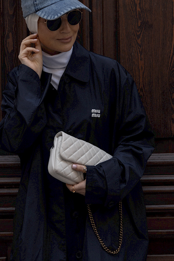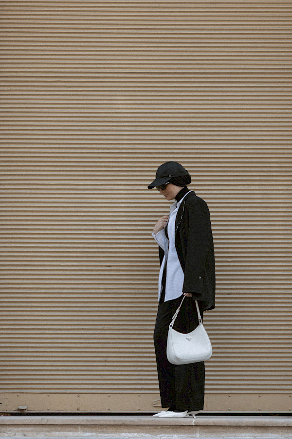 Black blazer Wonder Wander Shop, white shirt, black trousers MIU MIU, black cap TOTEME,