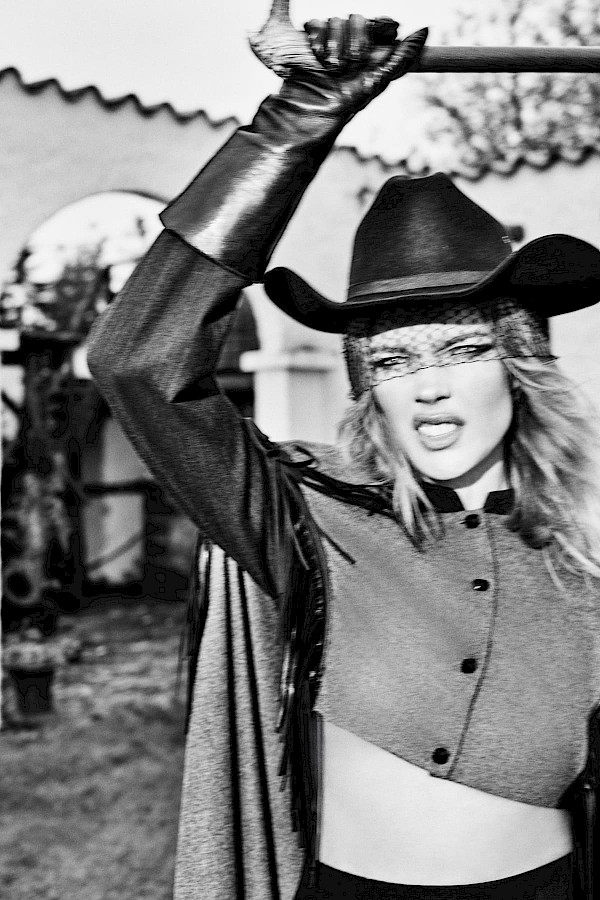 Ульяна Сергеенко отправила Наталью Водянову на родео. Но уезжать из Парижа не пришлось: звездный состав во главе с Эллен фон Унверт переместился на аутентичное ранчо буквально в столичном предместье, где подлинные объекты старины американского Юга и полный гараж ретромобилей легендарной русской музы парижской арт-сцены Дины Верни образовали идеальное созвучие с эстетикой Дикого Запада, вдохновившей резорт-коллекцию 2024-25. Знаковым для Ульяны стал образ Никиты Михалкова из эпохального советского вестерна «Свой среди чужих, чужой среди своих». С присущей ей утонченностью, в этом сезоне кутюрье обращается именно к ковбойской стилистике, сохраняя преклонение перед традиционными представлениями о красоте.