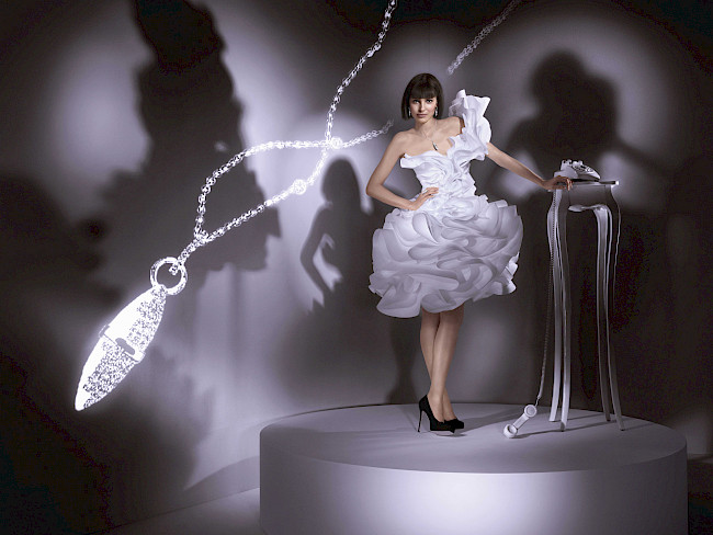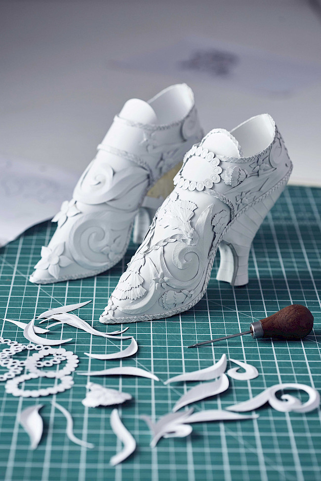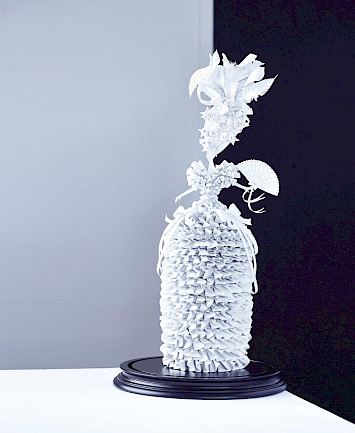Paper artist Zoe Bradley immersed herself into art of fashion, working on Alexander Mcqueen's collection No. 13, then creating couture paper dresses for Michiko Koshino. Over the last fifteen years, the artist has been mixing disciplines creating bespoke artworks for Louis Vuitton, Mont Blanc, Christian Dior, Missoni, Tiffany & Co., Chopard, De Beers, Harrods, Selfridges, and many other international brands. Turning 2D paper into 3D sculpture, Bradley aims to produce a powerful theatrical impression and imitates nature to evoke feelings of escapism.