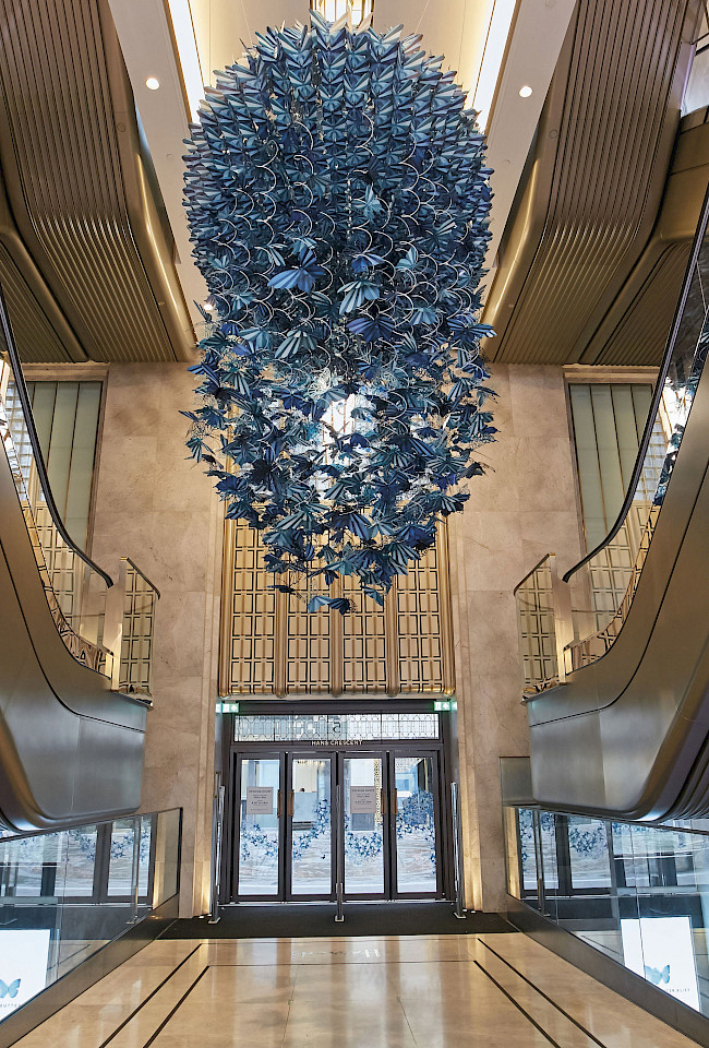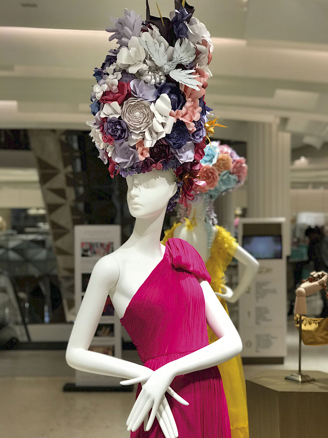 It usually starts with a client coming to me with an idea to create a piece of sculpture. It can add a focal point to an exclusive launch, or it can be as diverse as creating an art piece for a hotel lobby. I've created paper sculptures for a series of windows for luxury department stores or within large shopping malls. When I start collecting ideas, they come from everywhere. It can be a print I've seen on a vintage seed packet, a piece of theatre, a sculpture, these all filter down into creating a mood board. I try to visit the space and get a feel for the silhouette of the sculpture and sketch out ideas that will work in the space. I work with my team on storyboarding visuals, color palettes, silhouettes, and textures of papers. The initial process can start quite organically, but quickly it becomes more mathematical with scale plans interpreting window sizes from architectural drawings. Then my team and I look at the process of creating the paper textile to form the right silhouette. For example, if it is flowers, we then go into a sample stage where shapes are created that can have multiple layers and components that are all made by hand, scored, molded, and glued in many processes. By the time it comes to installation, it can feel like we have grown the flowers from seeds! The Zoe Bradley style is modern, clean, elegant, and fashion-focused with a timeless quality.