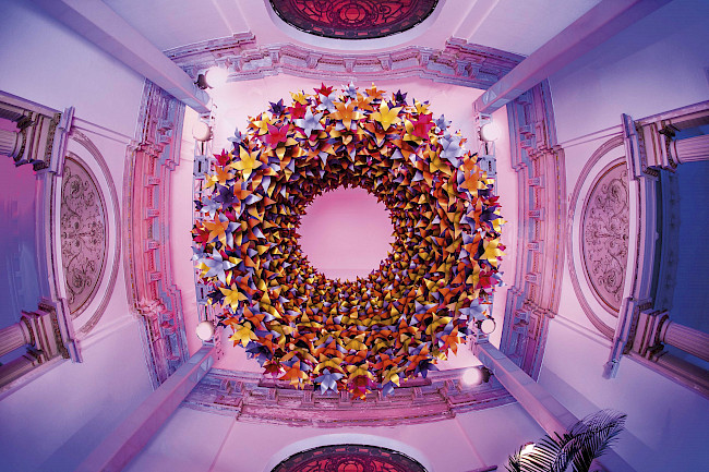 I remember it was a tight timeline, but I was keen to make it a multi-disciplinary installation, incorporating an animated film, moving flowers, and an immersive 360-degree flower-covered space. Galleria Melissa was the perfect venue for this floral spectacle, once home to the original London flower market. I created an exotic garden, celebrating the feminine, architectural forms of flowers. From the Piazza, we suspended a huge metal lotus sculpture, which appeared floating in the air. This was surrounded by three huge glass screens, which played a mesmerizing kaleidoscopic floral animation. It showed our 3D paper flowers blooming and bursting into life across giant screens. The viewer continued their journey downstairs, entering a psychedelic neon garden where the walls and floor were covered in vinyl paper, which had a photographic print of the Zoe Bradley exotic neon flowers onto it. It felt very 'other worldly', a bit like Alice in Wonderland, as the floral landscape played with the scale of the flowers and covered every inch of the room, even the doors were covered in the floral print. It received fantastic comments from the visitors to the gallery and was on display for a couple of months over the summer.