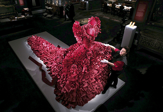 I have created over 20 paper couture gowns in the last 15 years. They are a real labor of love and can take up to 6 weeks to build. My favourite gown to date was a monumental red ruffle paper couture gown complete with a six-meter train created for Sotheby’s London. The dress was sculpted on a scale much larger than life to hold a magnifying glass up for the spectator to see all the intricacies of this heavily detailed gown. The red dress's texture was decorated with over 6000 hand-sculpted paper ruffles from small to large, along with accents of hand-sculpted roses. The paper couture gown is given its royal status through the application of hundreds of red coral Swarovski crystals. The bodice is adorned with miniature ruffles, ribbons, and roses that embellish a plunging bodice's neckline with large mutton shaped sleeves. The entire dress is created from a metallic red paper with an iridescent silk-like finish fitted onto a steel frame base crinoline. The design is a fusion of modern-day couture and 18th-century royal court dress, as red was the symbolic color of wealth at that time.