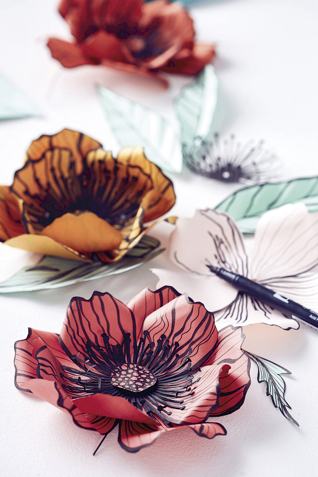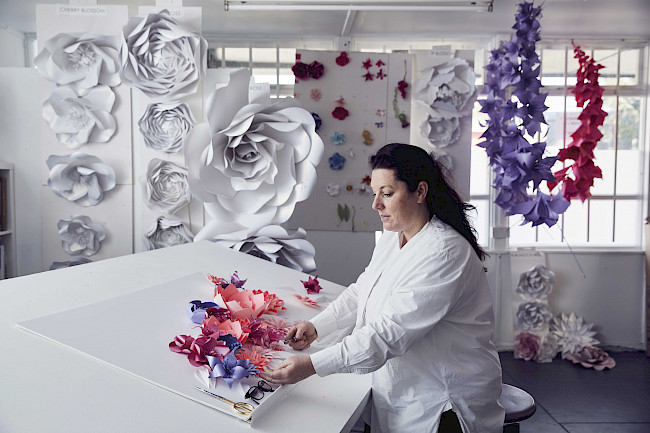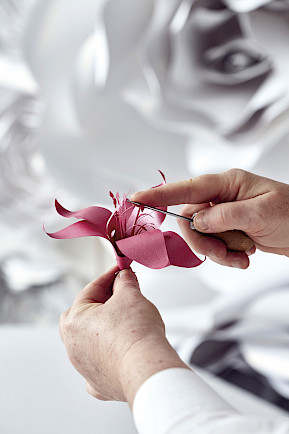 I will dissect real flowers to study the petals' form and shape, tracing these and altering shape to stylize them. I then work with my art worker, who follows my sketches and drawings, transferring the designs into illustrator files, which can then be cut by machine. It is then the real work starts, as it’s the hand sculpting of the paper, which I use a tool called a bradawl to help curl the paper. A process of bringing each petal to life.
