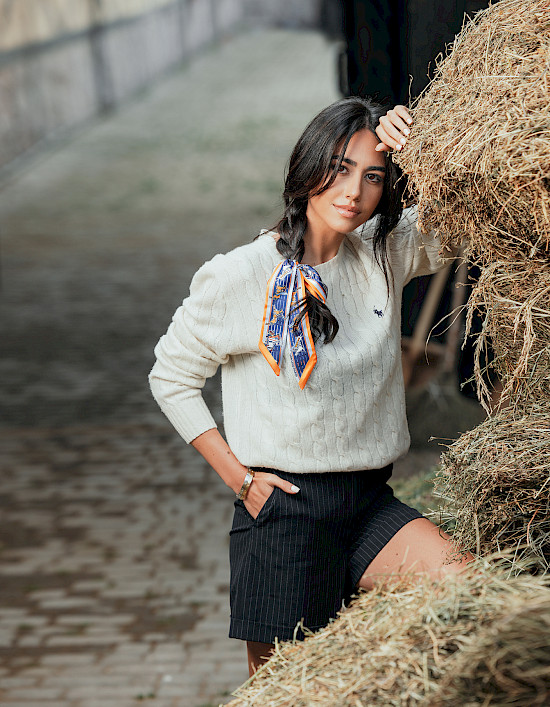 Sweater RALPH LAUREN, shorts BEYMEN CLUB, shoes LORA PIANA, scarf, bag HERMES
