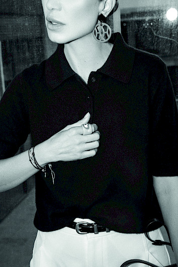 Поло THE ROW, шорты MODU, ремень SAINT LAURENT, кольца CHANEL, сумка и часы BVLGARI