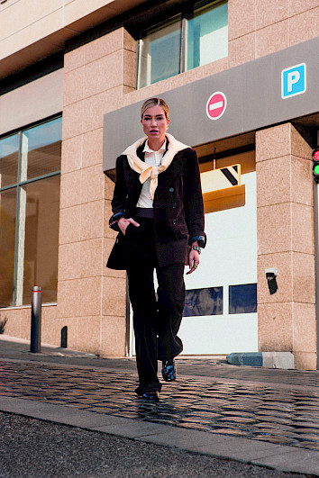 Жакет и обувь THE ROW, поло THE REAL BASE, брюки и свитер MASSIMO DUTTI, серьги KHAITE, кольца CHANEL.