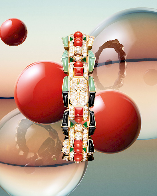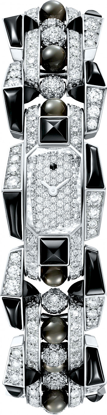 Изделие олицетворяет собой стремление к структурированности и созданию перспективы, проявляющиеся как в характерной форме звеньев браслета, так и в мини-корпусе с 16-гранным шлифованным стеклом. Невольно вспоминается наследие легендарной Жанны Туссен и ее чувство объема, благодаря которому еще в 1930-х она пришла к великолепному сочетанию драгоценности и индустриальной эстетики.