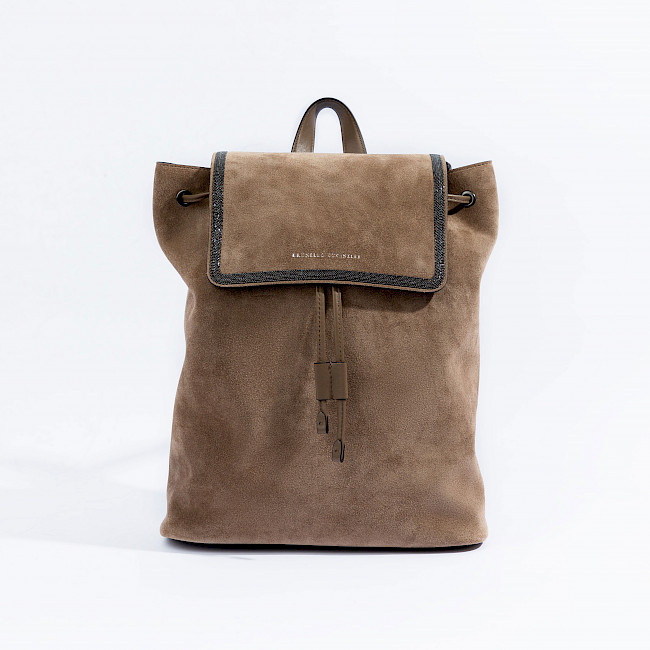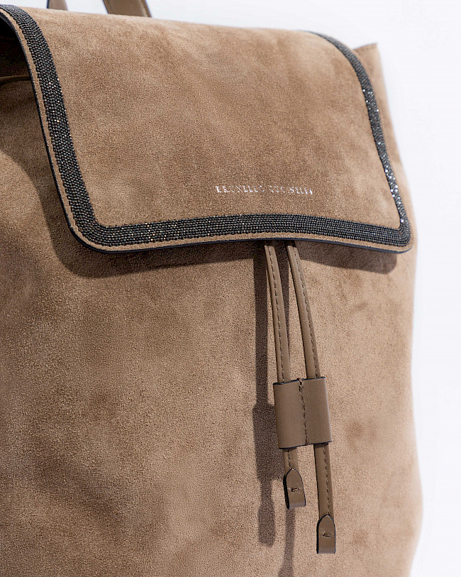 Рюкзак из замши с лаконичными и мягкими линиями с изысканным декором из блестящей цепочки Мониль могут стать прекрасным дополнением любого повседневного образа. Застежка-мешочек с кулисой и регулируемые лямки сделают вашу прогулку комфортной.