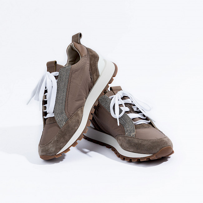 Для пошива кроссовок из весенне-летней коллекции бренда использовали комбинацию прочного нейлона с плетением рипстоп и мягкой бархатистой замши, которой укрепили мыс и задник. Традиционную для такой обуви шнуровку подчеркнули несколькими рядами знаковой для бренда цепочки Мониль.
