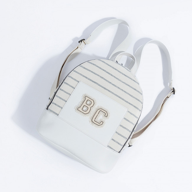 Белый рюкзак выгодно отличается контрастом фактур гладкой наппы с деликатным блеском и хлопковым трикотажем с тонким полосатым мотивом. Передняя панель декорирована текстильной аппликацией в виде BC-монограммы, расшитой цепочками Мониль. Аксессуар с подкладкой из водонепроницаемой ткани закрывается встречной молнией, внутрь которого с легкостью поместятся планшет, сменная пара обуви и бутылка воды.