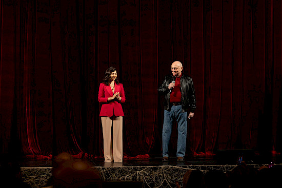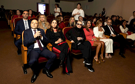 На сцене гостей поприветствовали главный режиссёр Азербайджанского государственного русского драматического театра им. Самеда Вургуна Александр Шаровский и директор Издательского дома NARGIS Айтен Гусейнова.