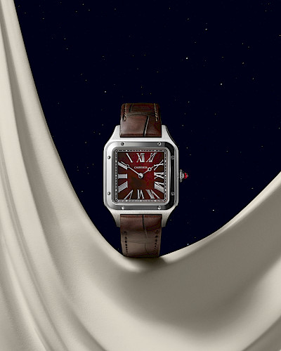 Meanwhile, the Santos-Dumont Rewind watch redefines the course of time with its carnelian dial, showcasing a limited edition platinum masterpiece. Bold Roman numerals arranged in reverse tradition signify a departure from convention—a fitting tribute to Santos-Dumont's boundless imagination.