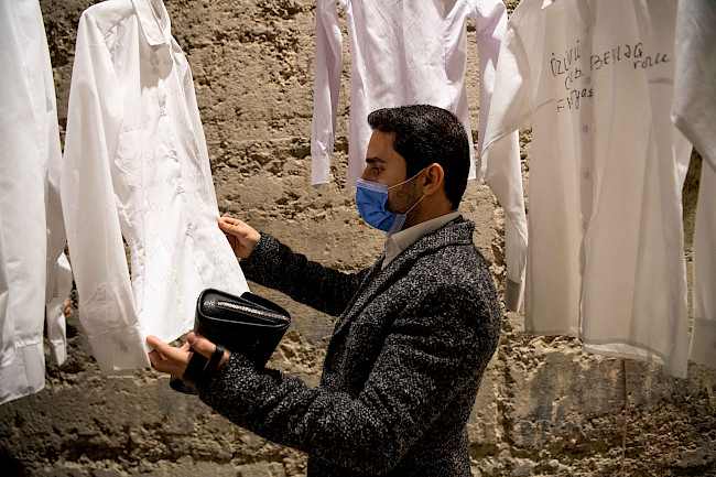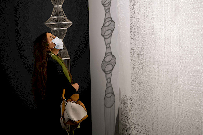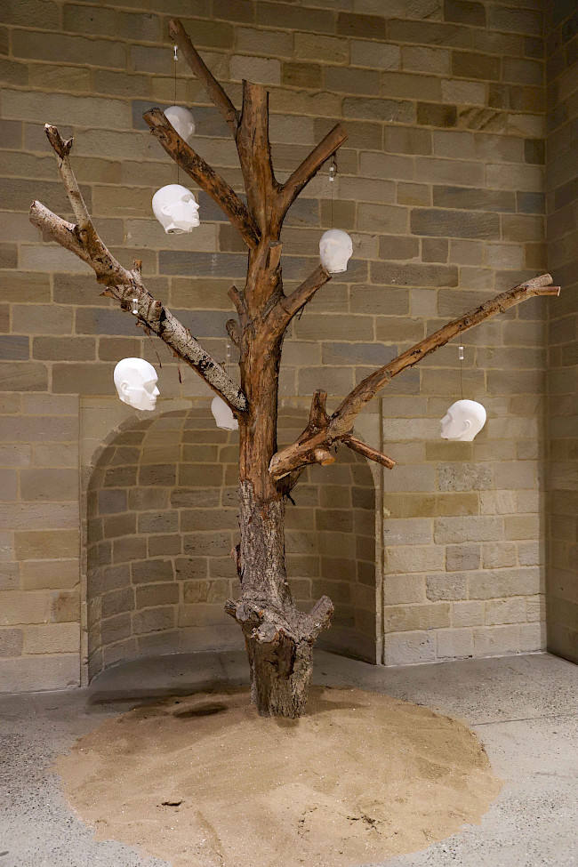Скульптура Хабиба Сахера «В ожидании Годона» отражает в себе течение времени. По истечению времени гипсовые черепа скульптуры будут падать со старого дерева во время выставки.