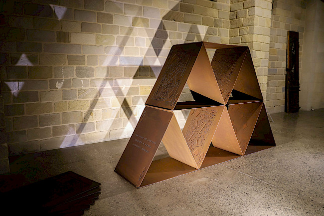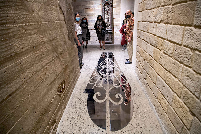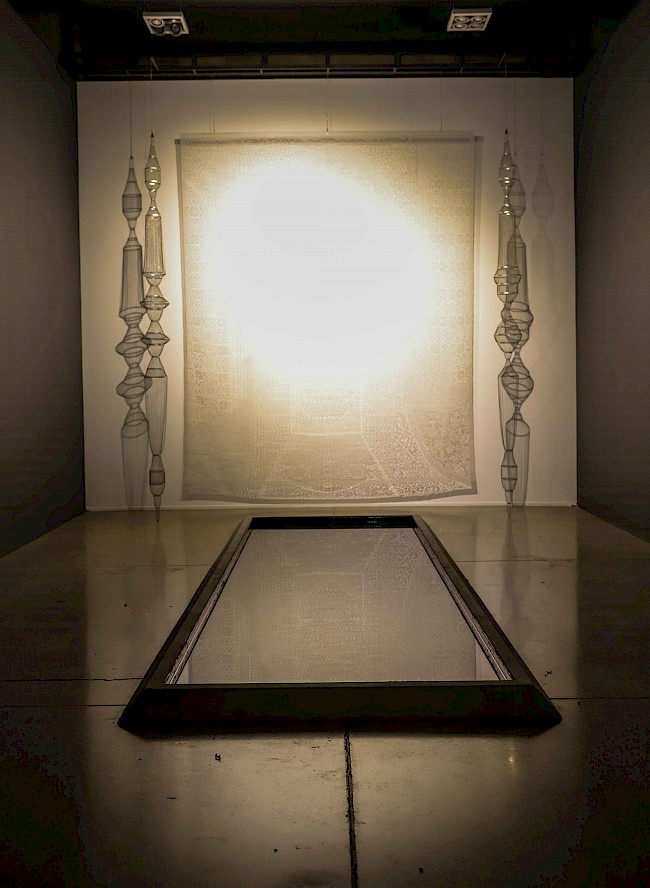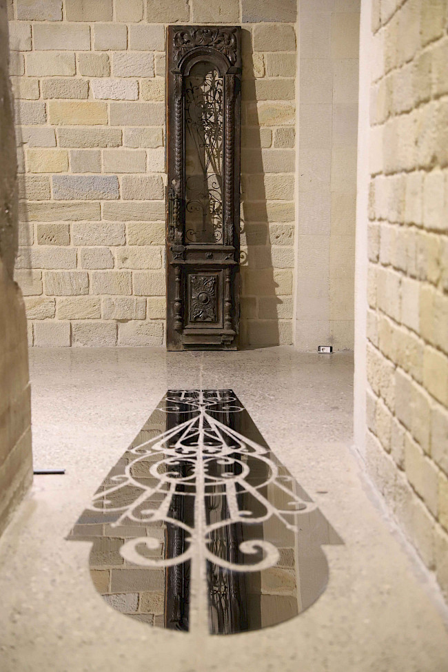 Инсталляция Аиды Махмудовой «Untitled» представляет собой декоративную дверь из Советского квартала в Баку и отражает модернизацию Азербайджана с точки зрения памяти, ностальгии и местной самобытности.