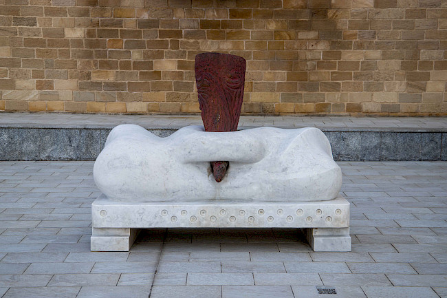 Скульптура Махмуда Рустамова «Спящий на горизонте» выполнена в характерном модернистском стиле и отражает рог изобилия в божественном облаке, спускающемся с неба.